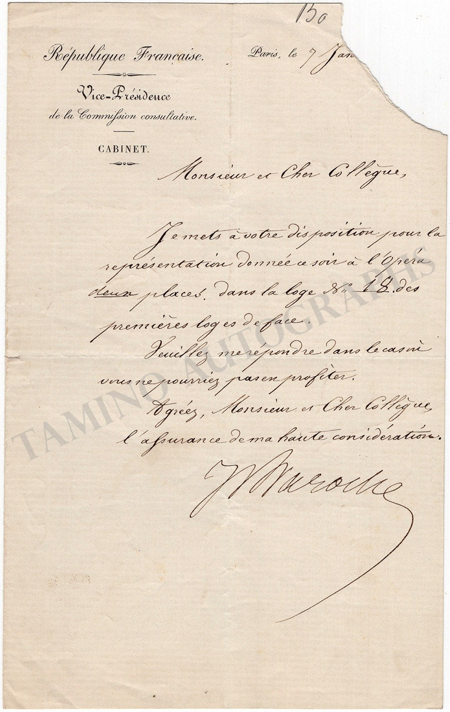 C. Paris, le 7 Janv. by French lawyer and politician, son of Ernest, Pierre Jules Baroche, to a colleague: “…je mets à votre disposition pour la représentation donnée ce soir à l’Opéra deux places…”. 1 p. In-8. With letterhead.