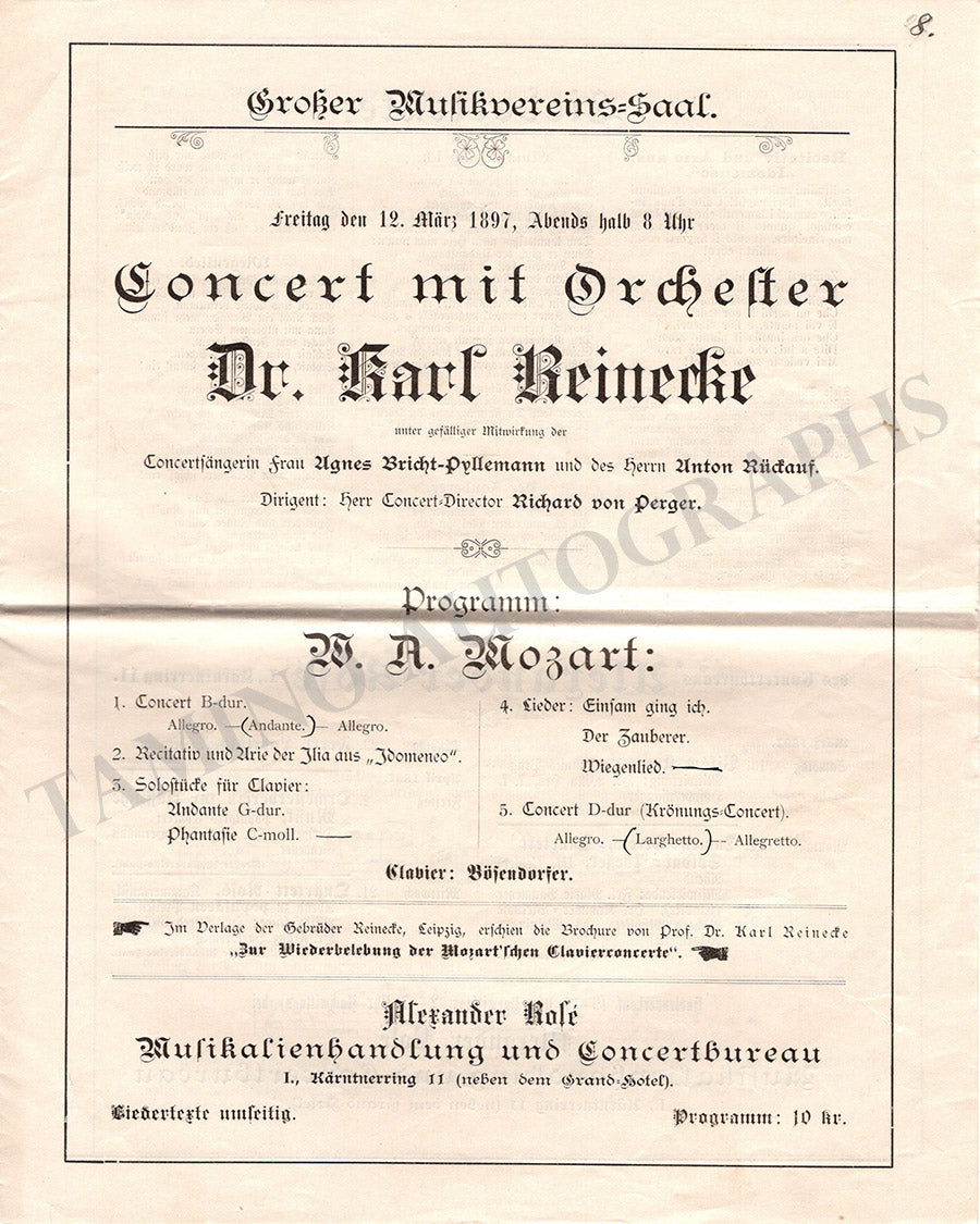 Program for a concert in Vienna on March 12th, 1897, in honor of Dr. Carl Reinecke.