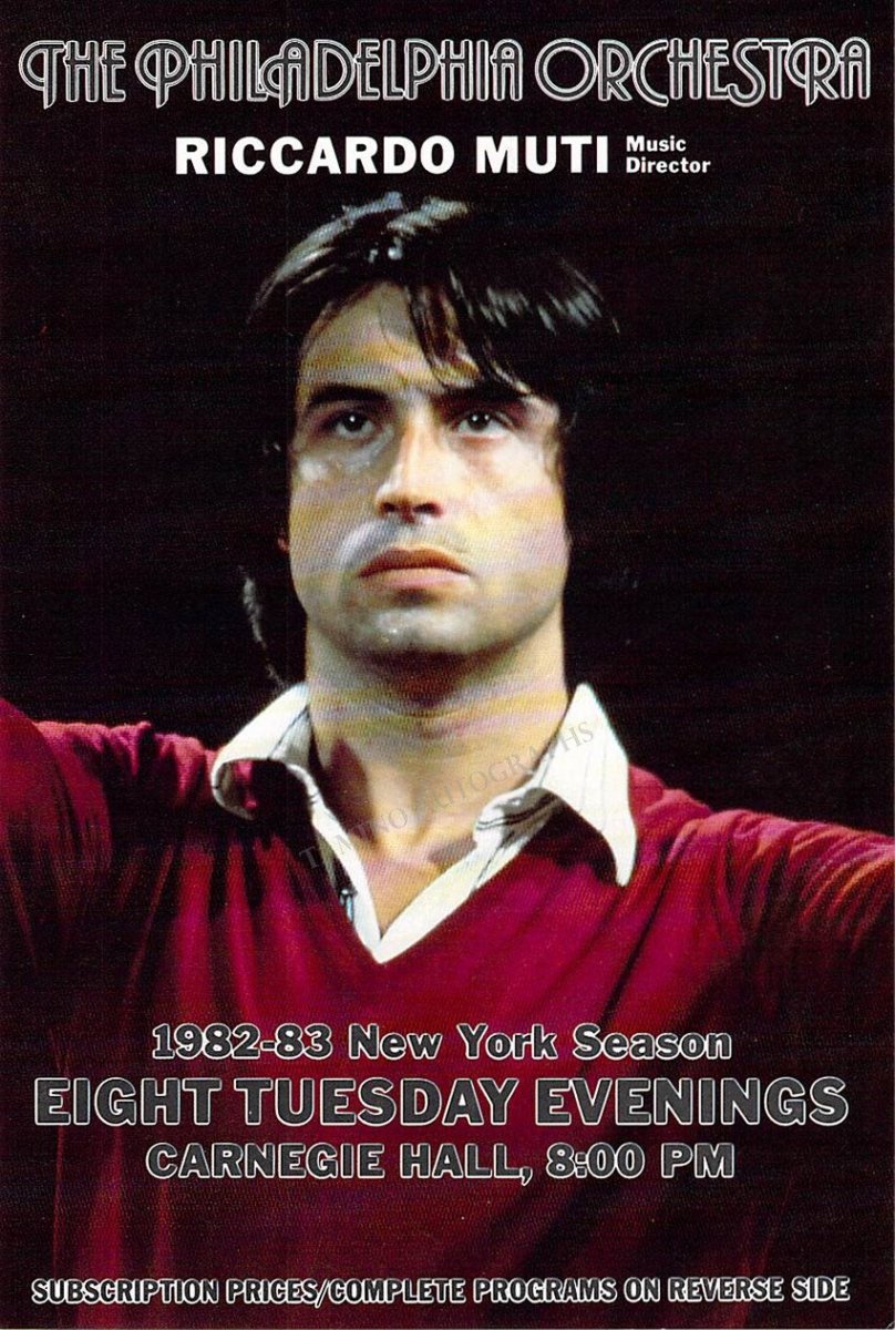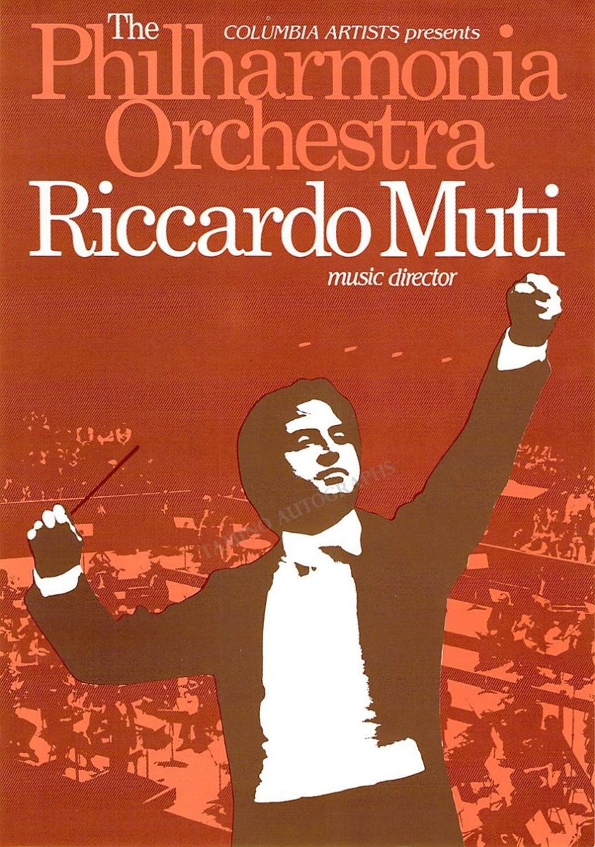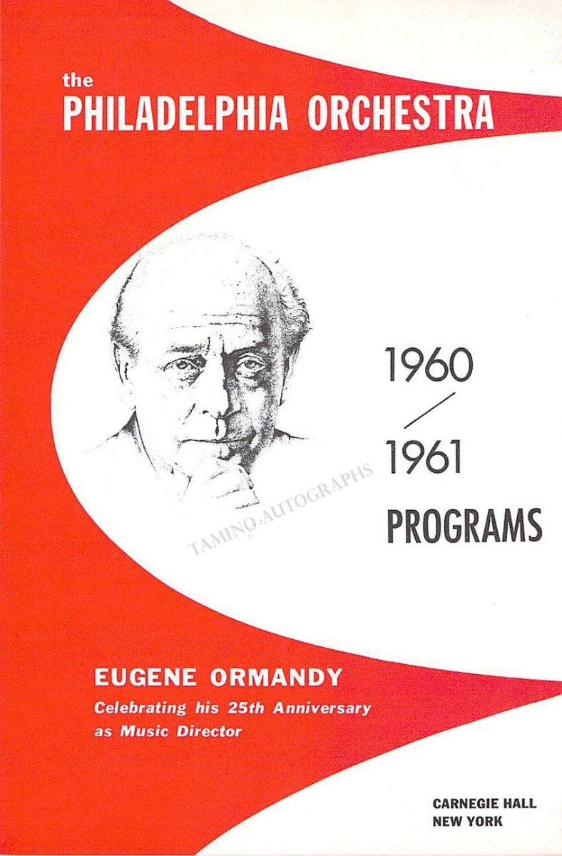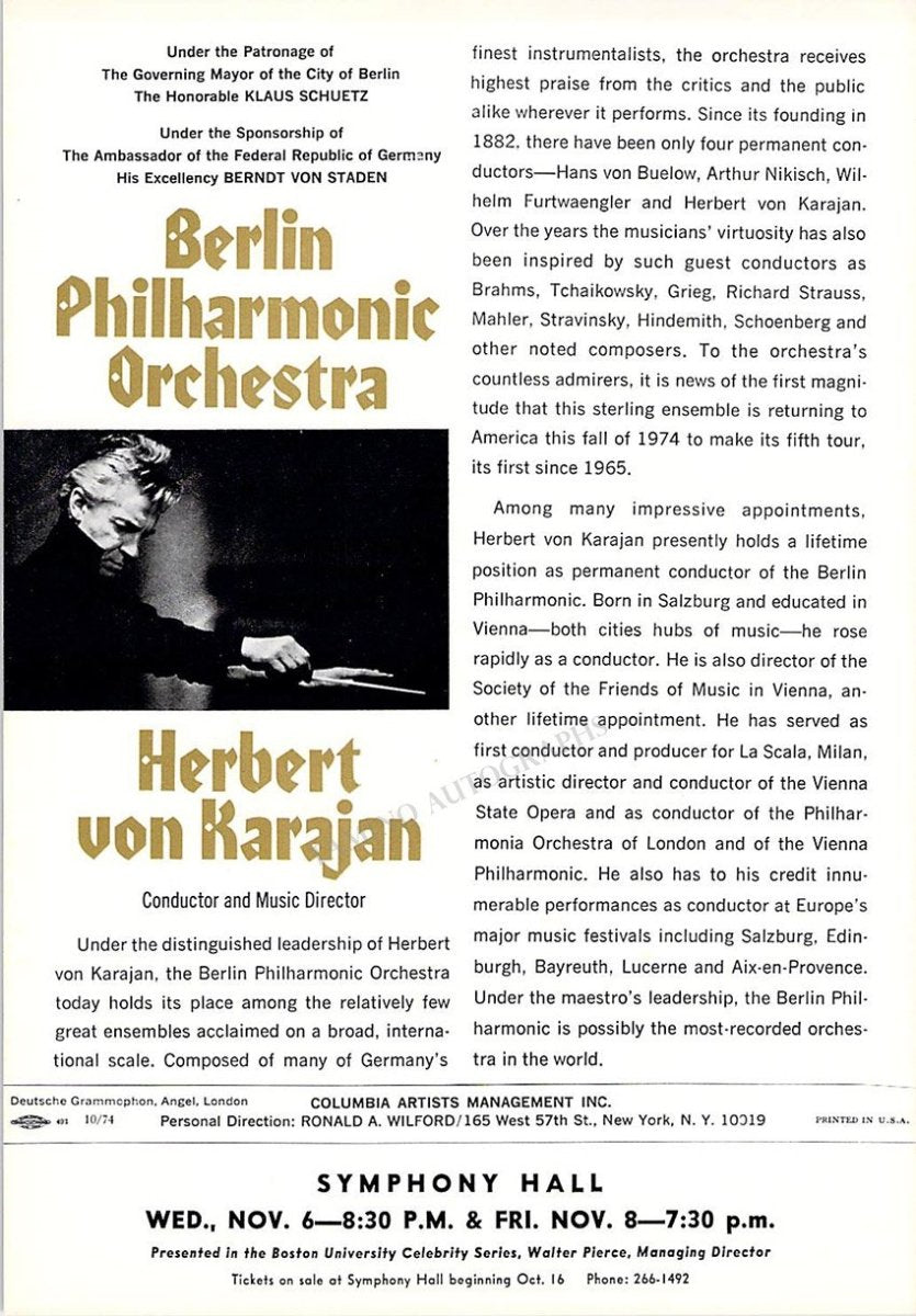 Lot of 14 concert playbills, 13 of them are one-sheet printed on both sides, 1 has 4 pages, announcing concerts of famous conductors and orchestras. Artists include Loorin Maazel, Kurt Masur, Claudio Abbado, Riccardo Muti, Eugen Ormandy (4 pages), Herbert von Karajan, Georg Solti, Dimitri Mitropoulos, Herbert Blomstedt, Yevgueni Mravinski and others. Various sizes ranging from 6 x 9 inches to 6.5 x 10.5 inches, all in excellent condition.