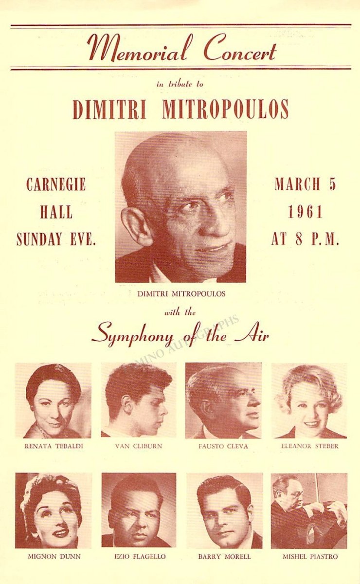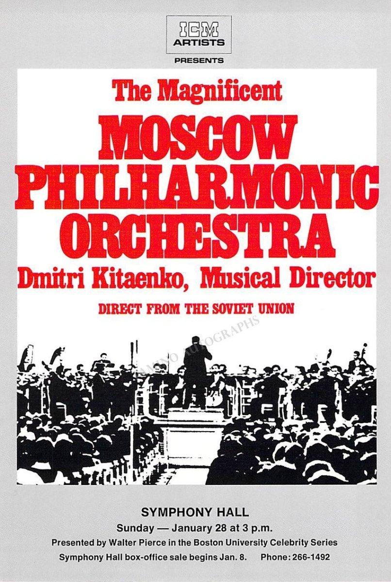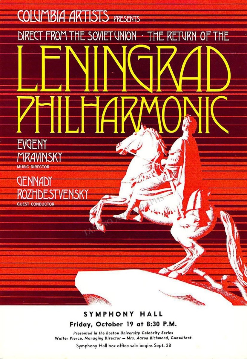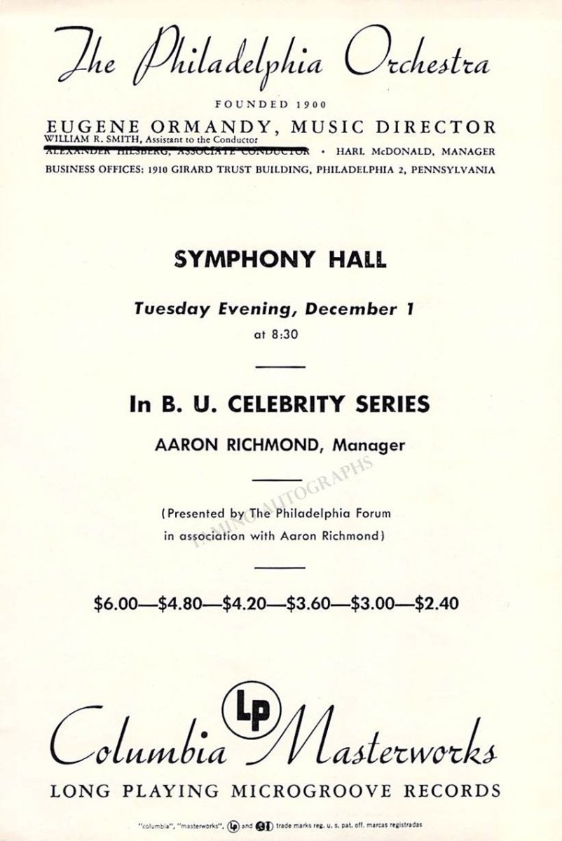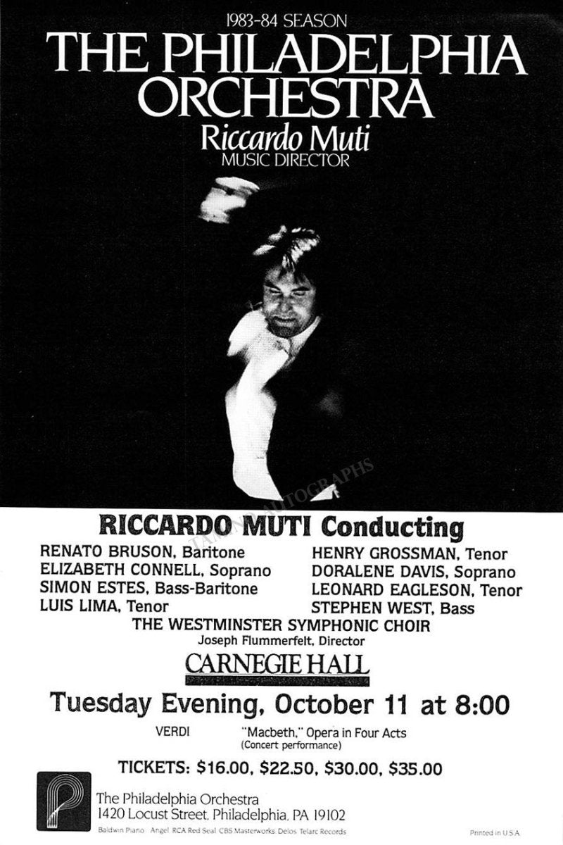 Lot of 14 concert playbills, 13 of them are one-sheet printed on both sides, 1 has 4 pages, announcing concerts of famous conductors and orchestras. Artists include Loorin Maazel, Kurt Masur, Claudio Abbado, Riccardo Muti, Eugen Ormandy (4 pages), Herbert von Karajan, Georg Solti, Dimitri Mitropoulos, Herbert Blomstedt, Yevgueni Mravinski and others. Various sizes ranging from 6 x 9 inches to 6.5 x 10.5 inches, all in excellent condition.
