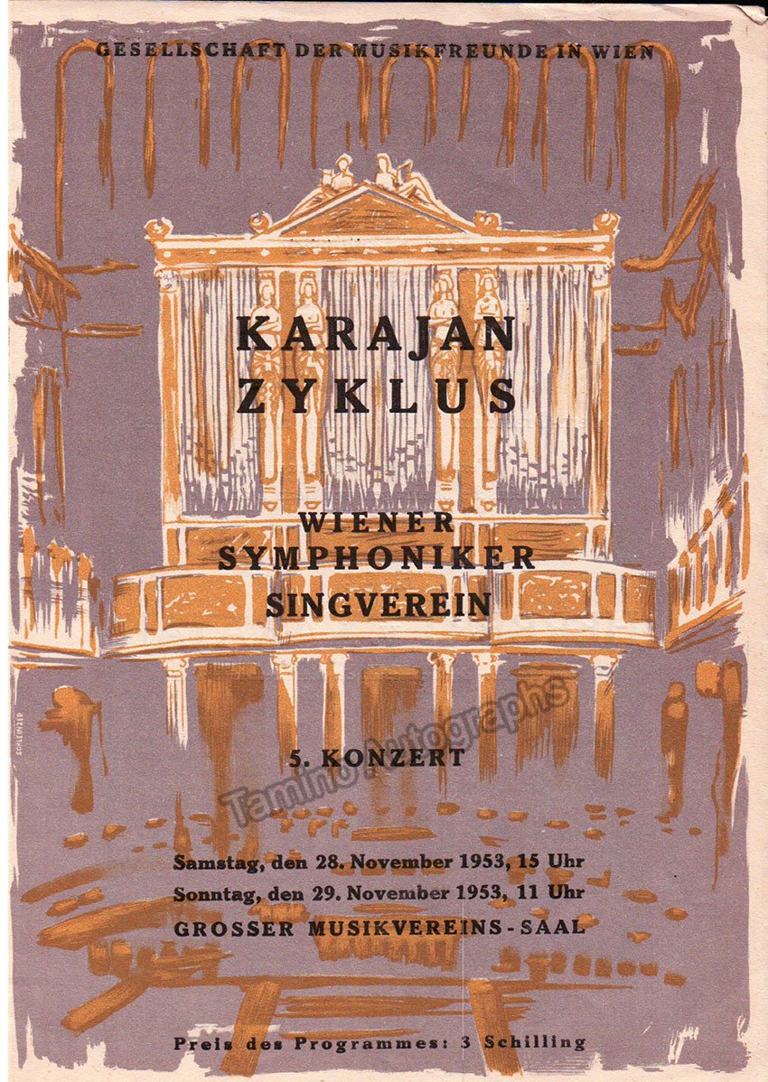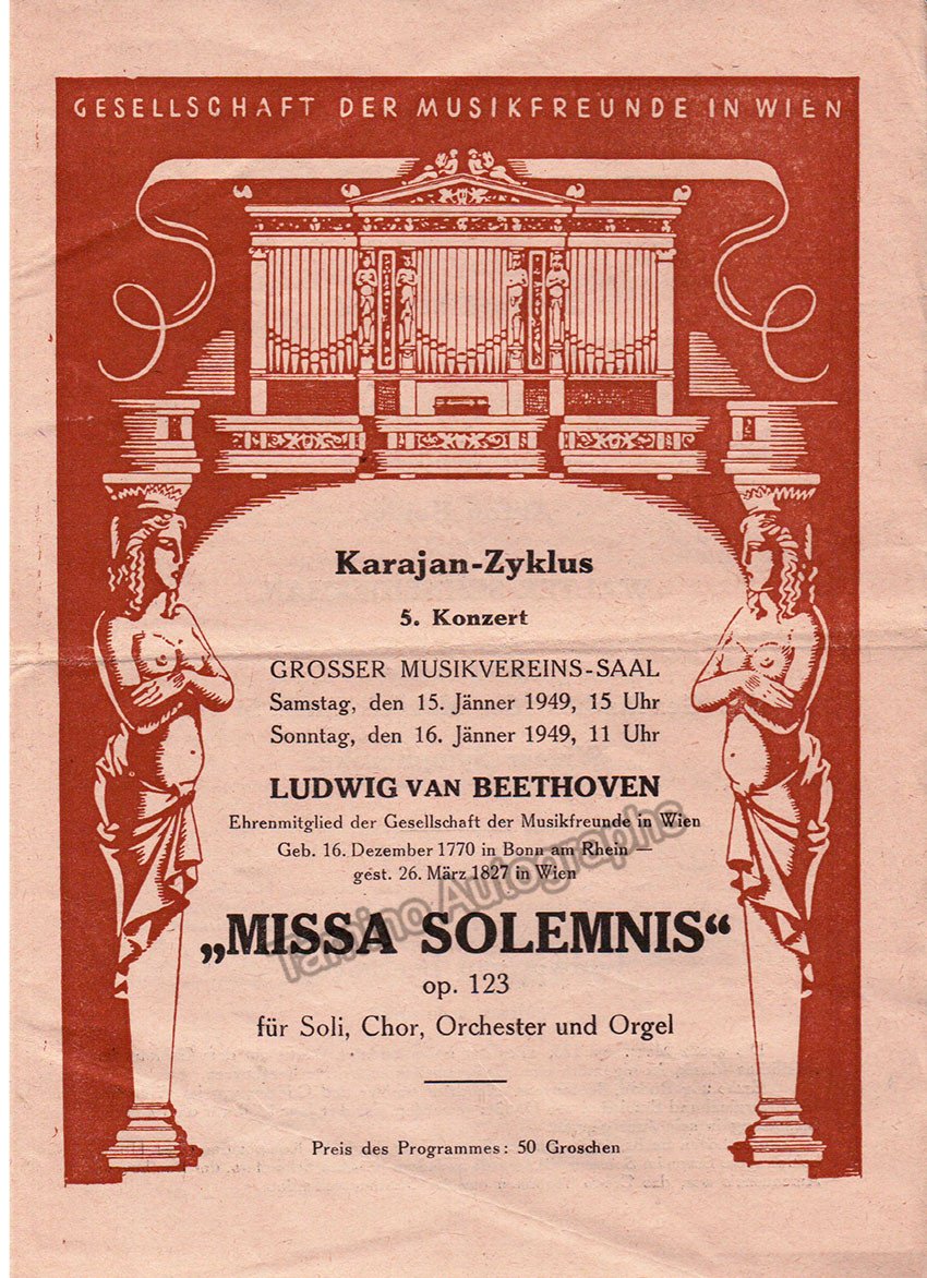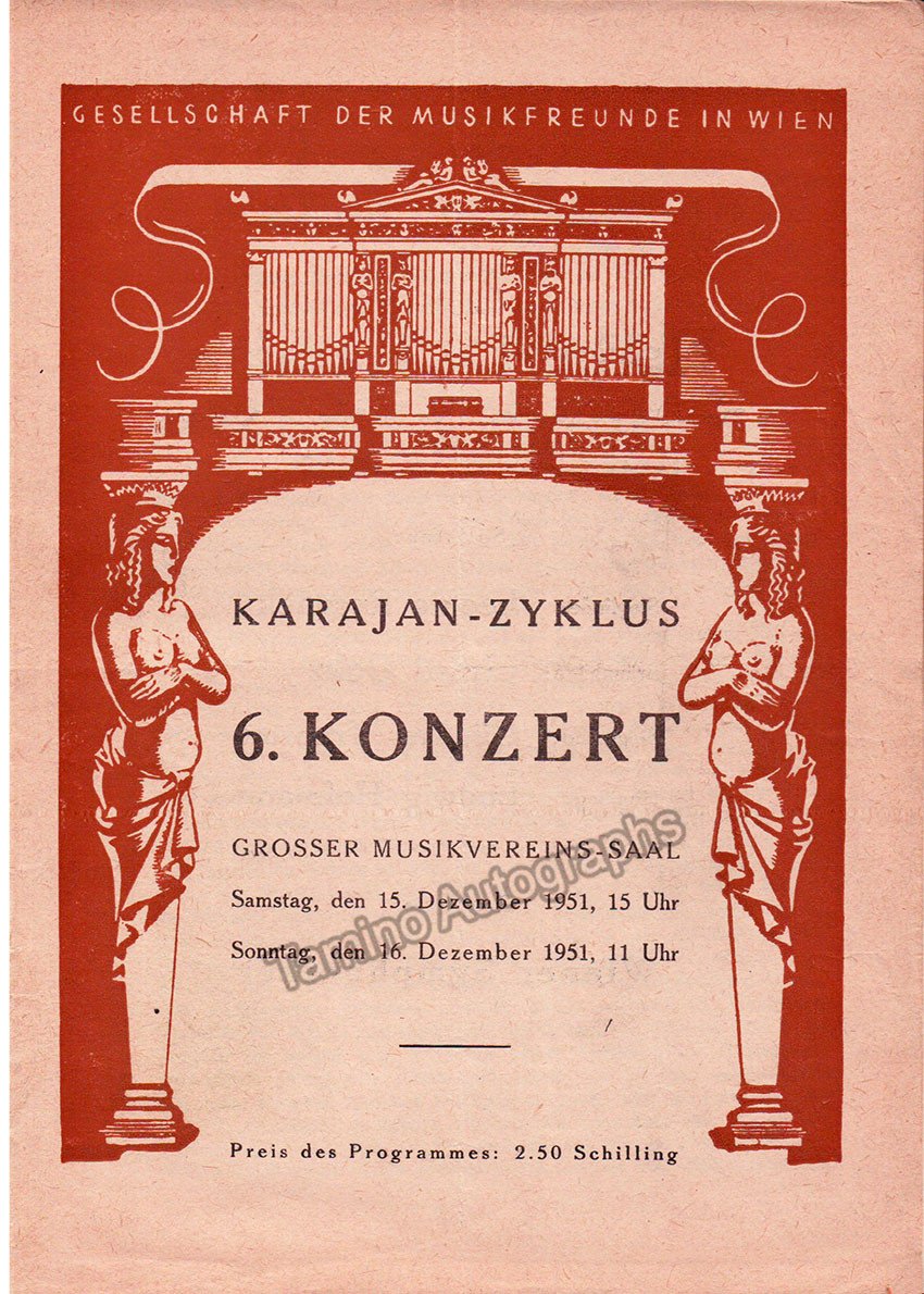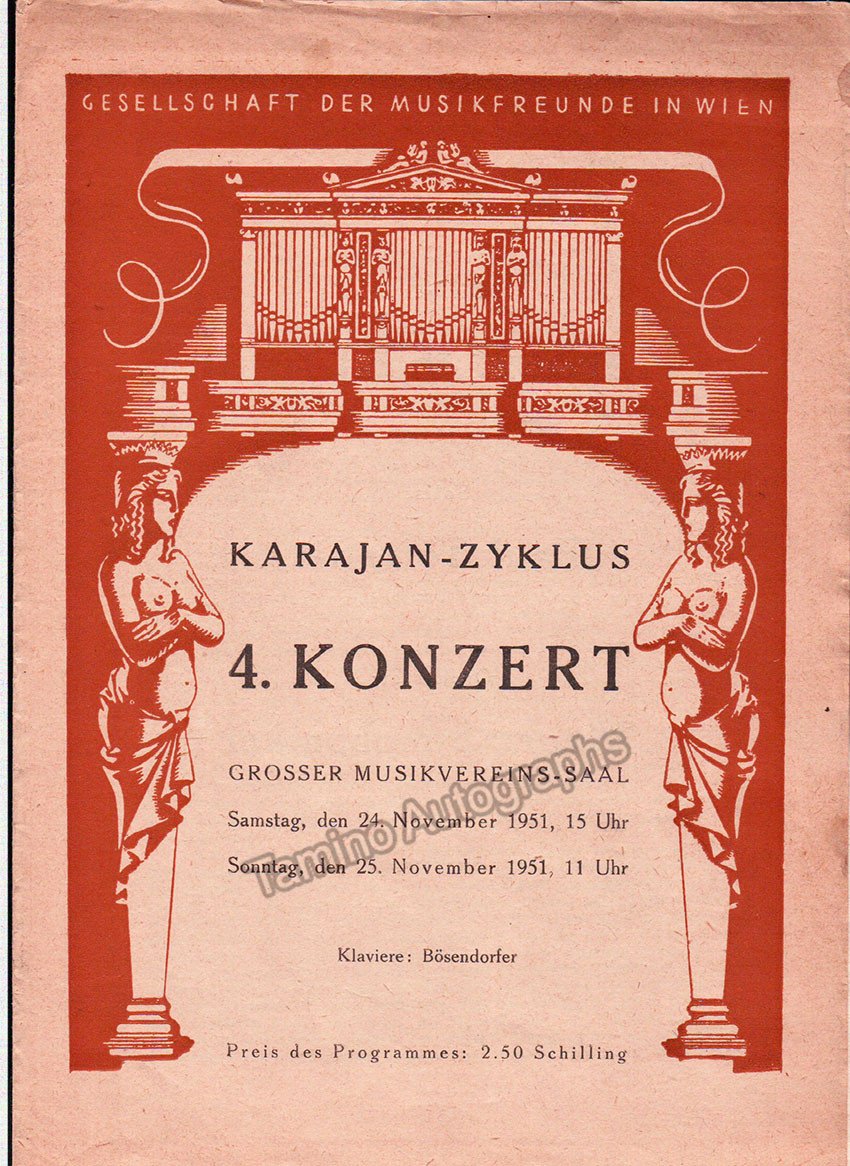 Lot of 10 full programs, Karajan conducting Wiener Symphoniker. 15-16 Jan 1949: Missa Solemnis (Beethoven) with Seefried, Hongen, Patzak, Schoffler as soloists, Walter Schneiderhan as violin solo. 21-22 March 1951: Mass in B-Minor (Bach). 15-16 Dec 1951: Wagner concert with highlights from Der Ring, soloists: Rysanek, Goltz, Treptow and L. Hofmann. 27-28 Oct 1951: music by Bartok, Smetana and Brahms, with Paul Baumgartner as a piano soloist. 18-19 Oct 1952: all-Beethoven program, with Walter Schneiderhan as violin soloist. 8-9 Nov 1952: all-Beethoven program. 6-7 Jun 1953: Fidelio (Beethoven) in concert performance. 28-29 Nov 1953: Oedipus Rex (Stravinsky). 3-4 Jun 1953: music by Bartok, Mozart and Rachmaninoff, with Friedrich Wuhrer as piano soloist. All full programs, 6 x 8.25 inches in size.