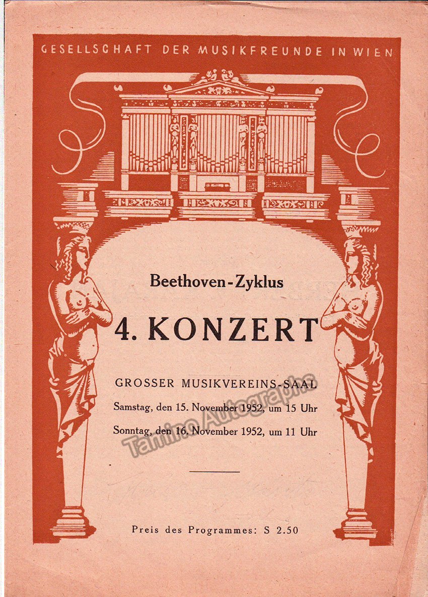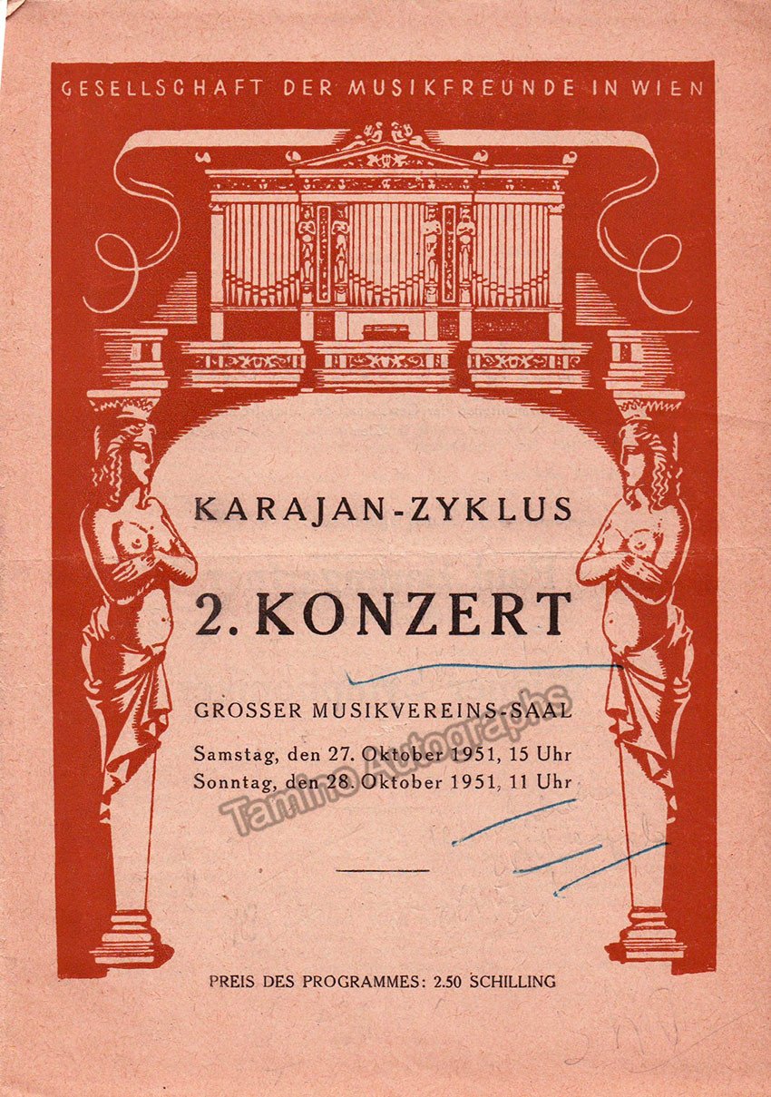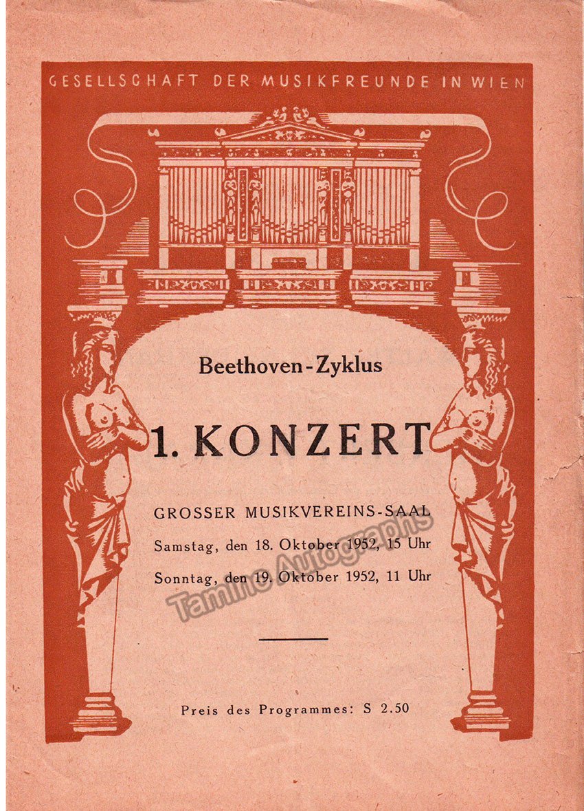 Lot of 10 full programs, Karajan conducting Wiener Symphoniker. 15-16 Jan 1949: Missa Solemnis (Beethoven) with Seefried, Hongen, Patzak, Schoffler as soloists, Walter Schneiderhan as violin solo. 21-22 March 1951: Mass in B-Minor (Bach). 15-16 Dec 1951: Wagner concert with highlights from Der Ring, soloists: Rysanek, Goltz, Treptow and L. Hofmann. 27-28 Oct 1951: music by Bartok, Smetana and Brahms, with Paul Baumgartner as a piano soloist. 18-19 Oct 1952: all-Beethoven program, with Walter Schneiderhan as violin soloist. 8-9 Nov 1952: all-Beethoven program. 6-7 Jun 1953: Fidelio (Beethoven) in concert performance. 28-29 Nov 1953: Oedipus Rex (Stravinsky). 3-4 Jun 1953: music by Bartok, Mozart and Rachmaninoff, with Friedrich Wuhrer as piano soloist. All full programs, 6 x 8.25 inches in size.