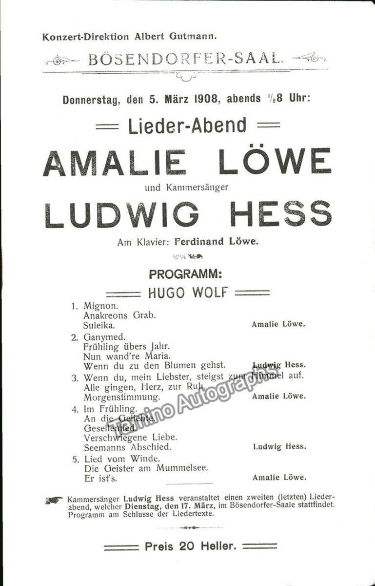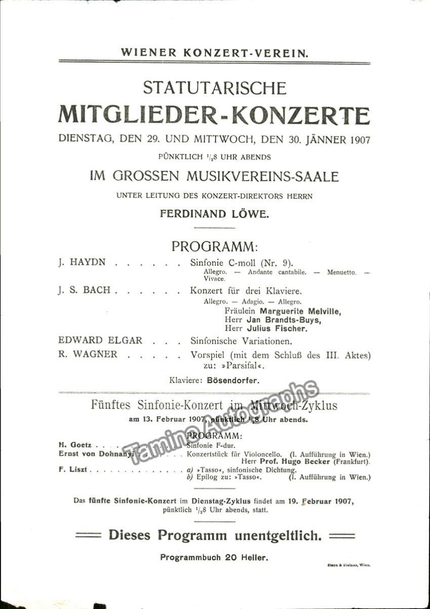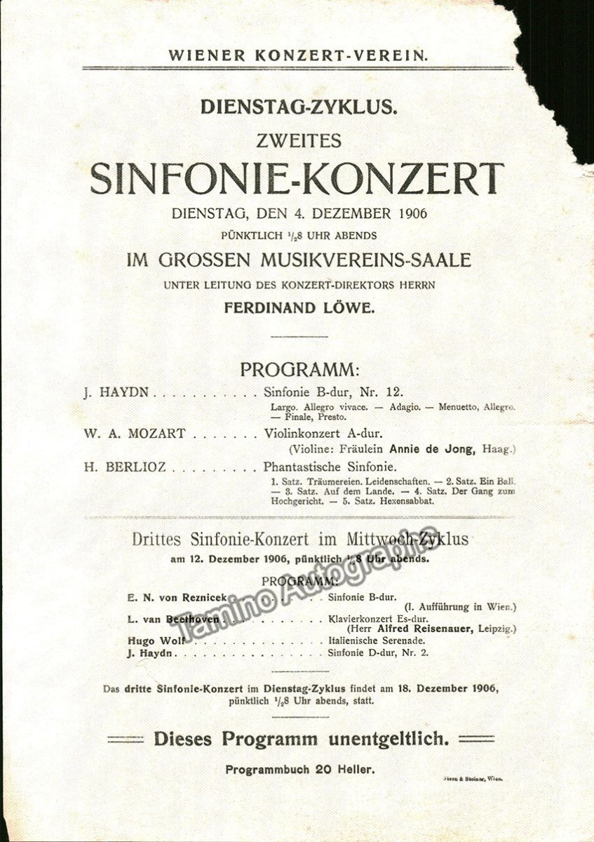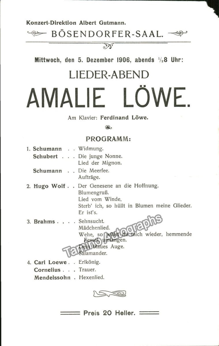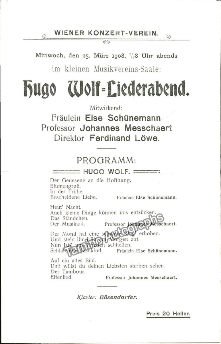 The 6 programs are: - Ferdinand Loewe conducting Vienna Symphony Orchestra , 29-30 January 1907. Haydn, Bach, Elgar, Wagner. Pianists: Julius Fischer, Jan Brandts-Buys & Marguerite Melville. - Ferdinand Loewe conducting Vienna Symphony Orchestra , 28-29 december 1909. Berlioz, Bach, Schumann, R. Strauss. Pianist: Harold Bauer. -  Ferdinand Loewe conducting Vienna Symphony Orchestra , 4 December 1906. Haydn, Mozart, Berlioz. Violin: Annie de Jong. - Recital by Amalie Loewe. At the piano: Ferdinand Loewe. Vienna, 5 December 1906. Schumann, Schubert, Hugo Wolf, Brahms, Carl Loewe, Cornelius, Mendelssohn. - Hugo Wolf Recital by Amalie Loewe and Ludwig Hess. At the piano: Ferdinand Loewe. Vienna, 5 March 1908. Songs of Hugo Wolf. - Program Hugo Wolf Recital by Else Schünemann and Johannes Messchaert. At the piano: Ferdinand Loewe. Songs of Hugo Wolf.Three Hugo Wolf related items from the estate of Melanie Koechert, lover of Hugo Wolf. Sizes range from 7.5 x 10.5 inches to 9.5 x 11.5 inches