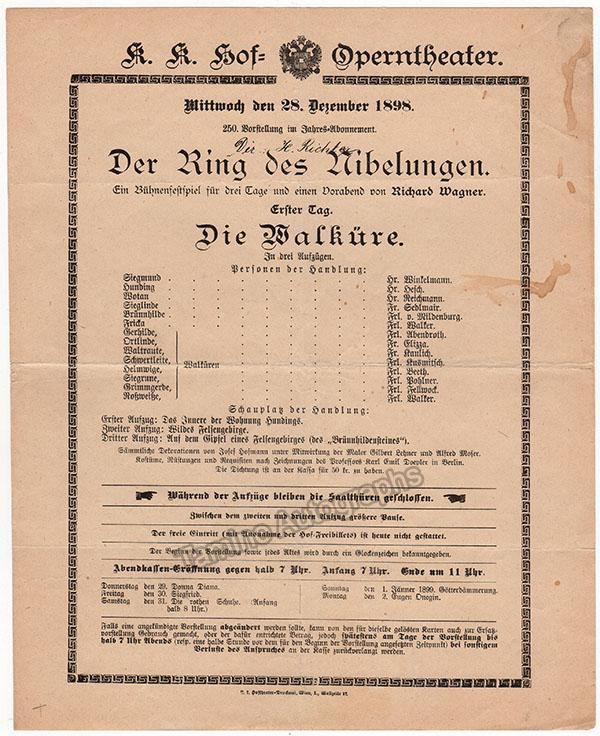 Program for a performance of Wagner's Die Walküre at the Operntheater in Vienna, 1898, conducted by Karl Richter (whose name is printed in ink at the top).  Size is 9.1 x 11.4 inches, 1 page, central fold, stains over right border, in very good condition.