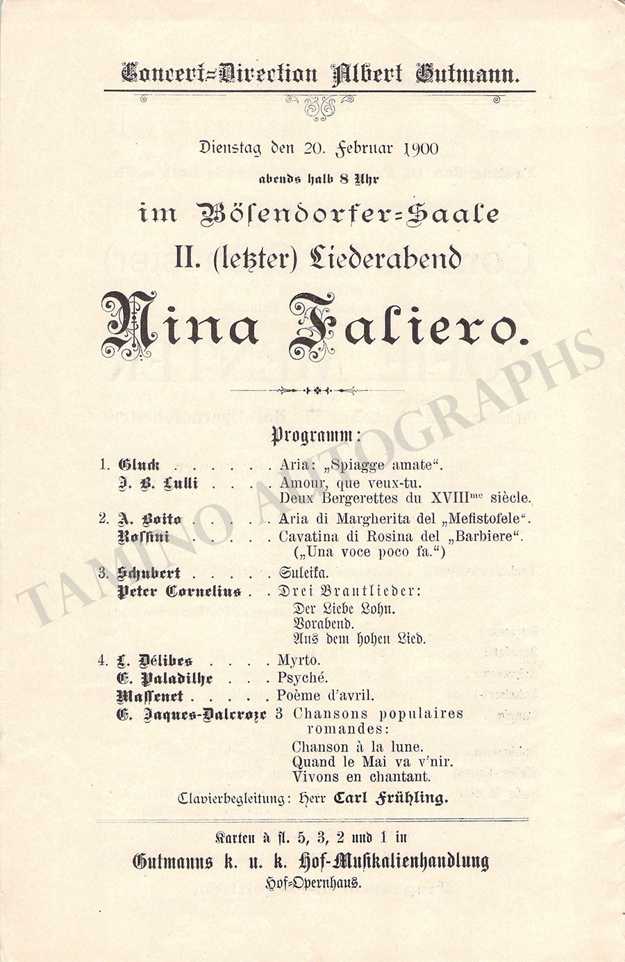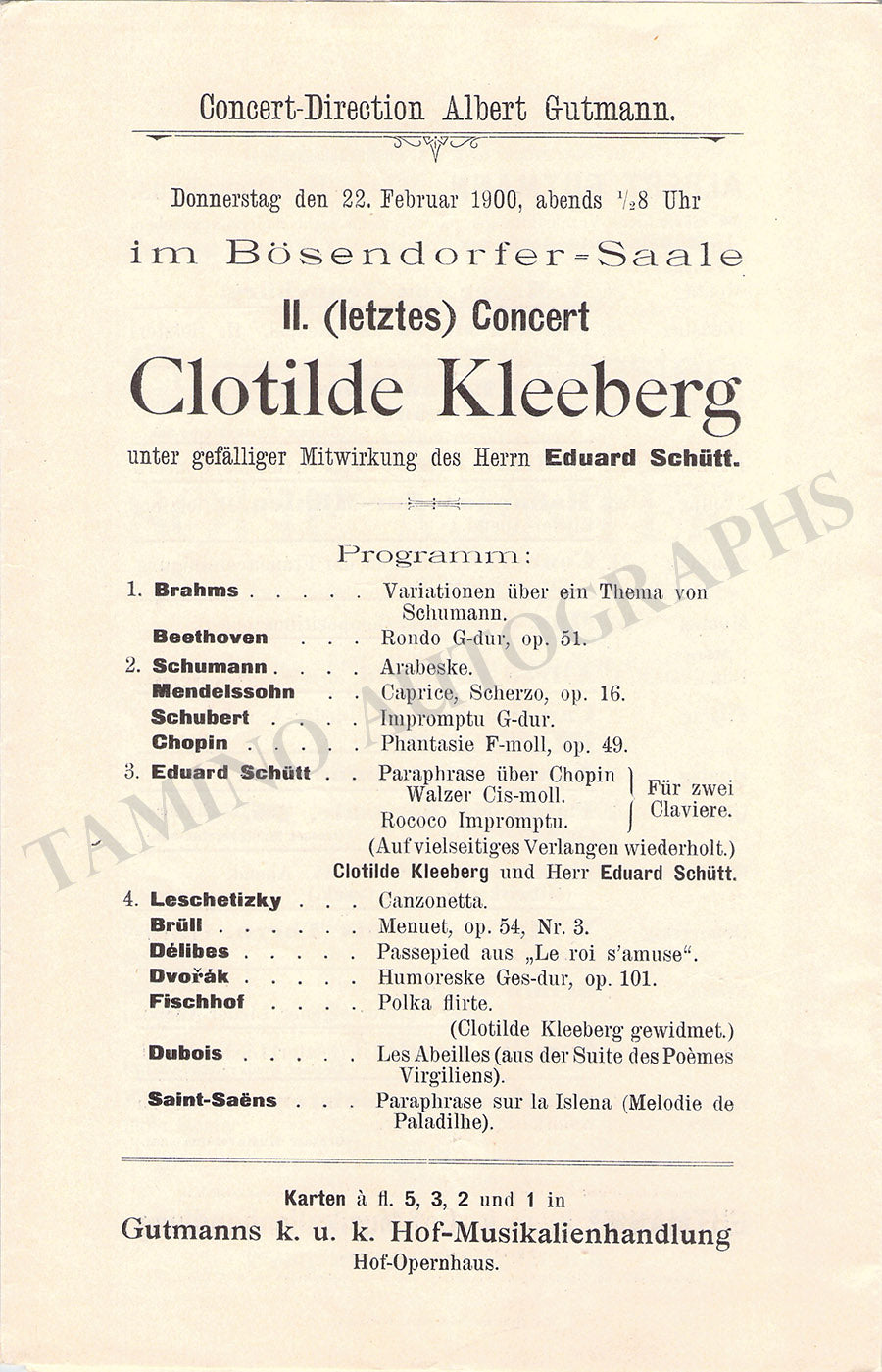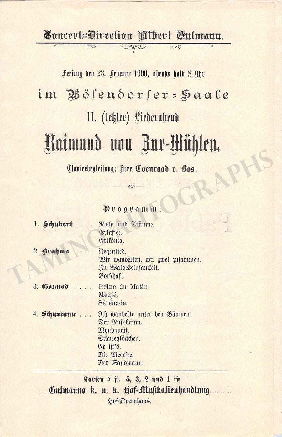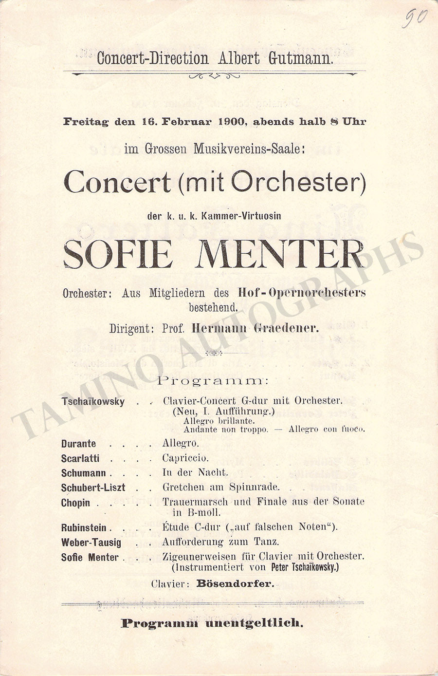 Set of 3 concert programs (unsigned) for performances of the German pianist in Vienna on December 3 & 11th, 1897, and February 16th, 1900.