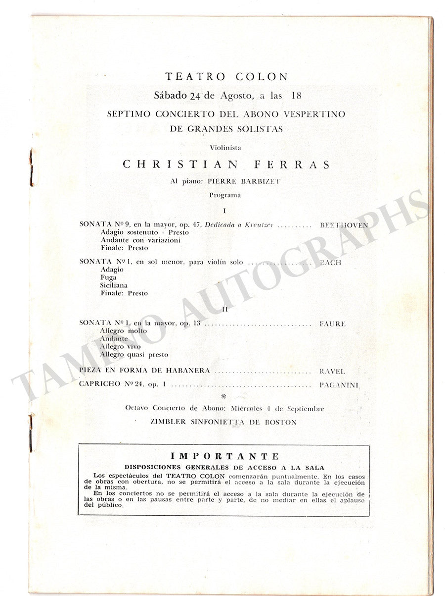 Unsigned program for a recital by the star French violinist at Teatro Colon, Buenos Aires, on August 24, 1957, performing works by Beethoven, Bach, Faure, Ravel, and Paganini, with pianist Pierre Barbizet.