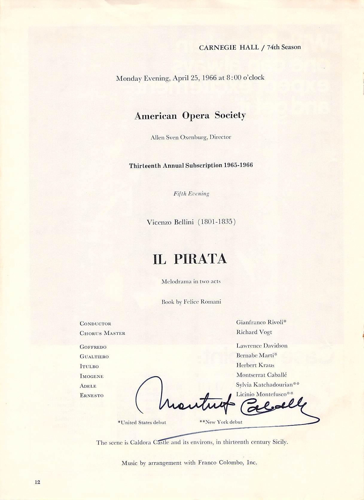 Page from a program for a concert performance of Bellini's Il Pirata at Carnegie Hall, New York, April 25th, 1966, starred and signed by the Spanish soprano on the cast page.  Size is 8 x 11 inches, some water stains over the lower-right corner, otherwise in excellent condition.