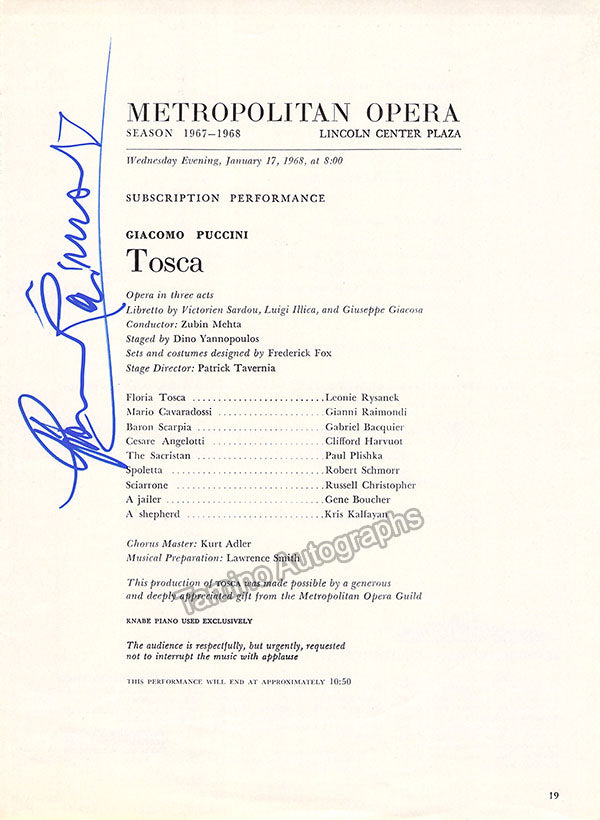Also included: 1 page 8 x 11 inch cast list of Metropolitan Opera 1968 performance of Puccini's Tosca in which he sang the role of Mario Cavaradossi with his signature at the left side of the page, several small creases, otherwise in very good condition. Not sold separately.