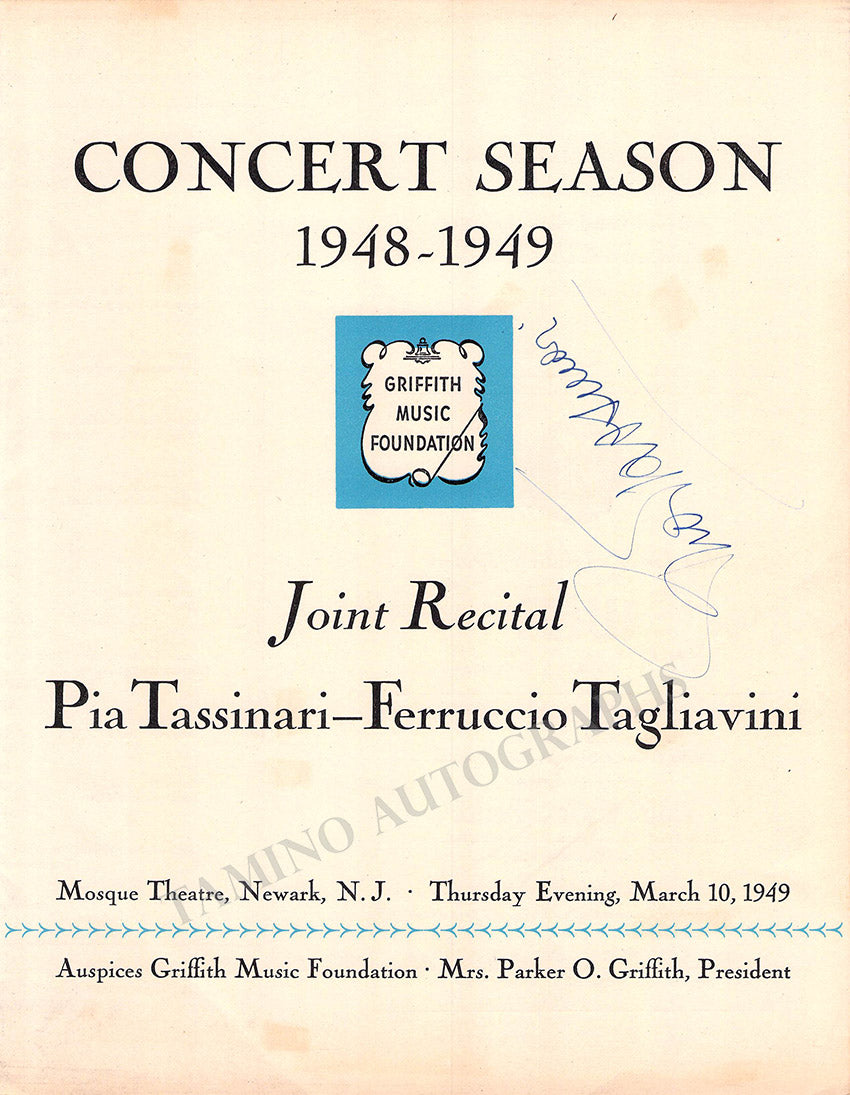 Set of 2 programs for a performance of both artists at the Mosque Theater, Newark, USA, on March 10, 1949, signed by them on the front cover (Tagliavini signed one program and Tassinari the other program).