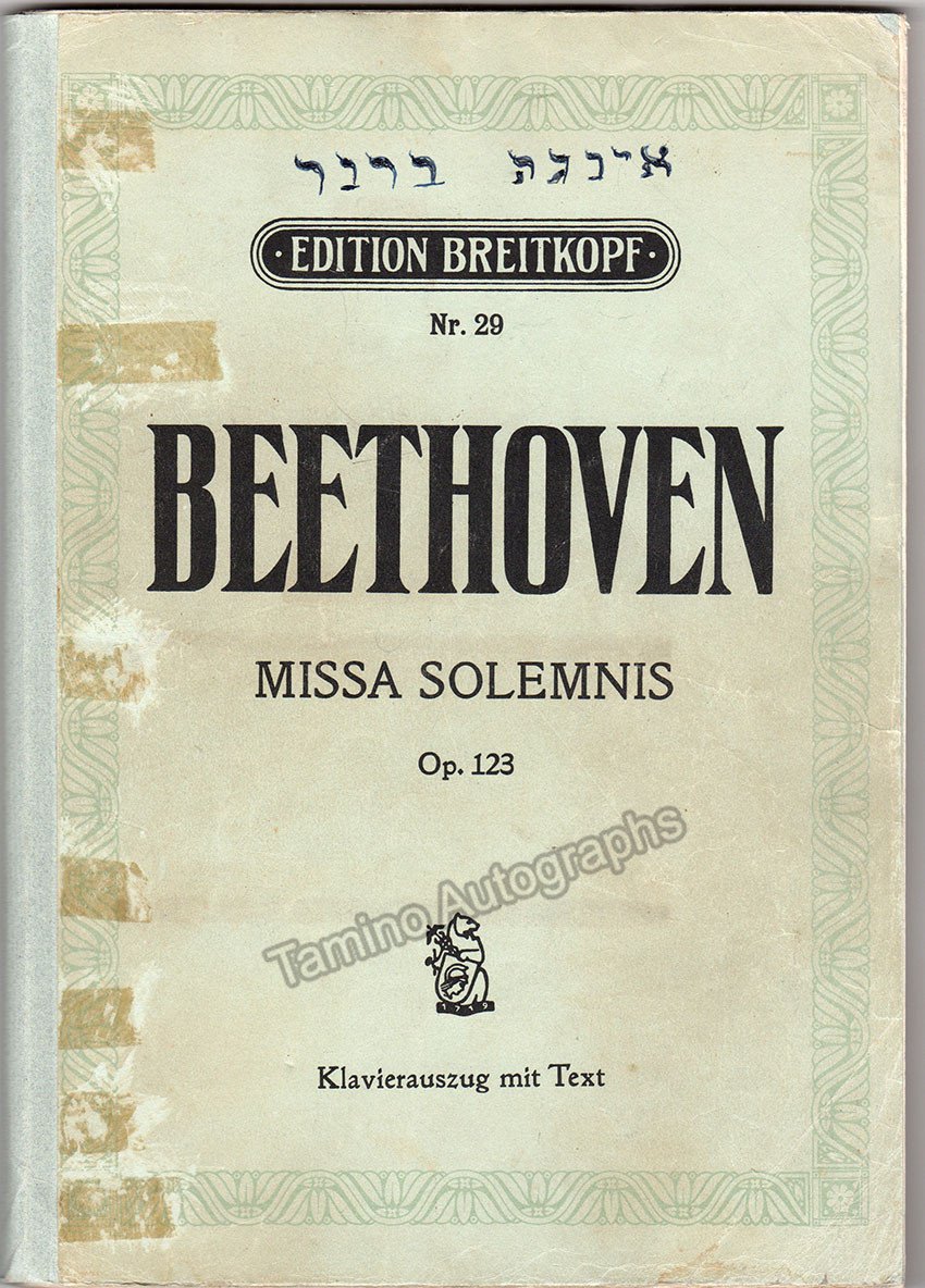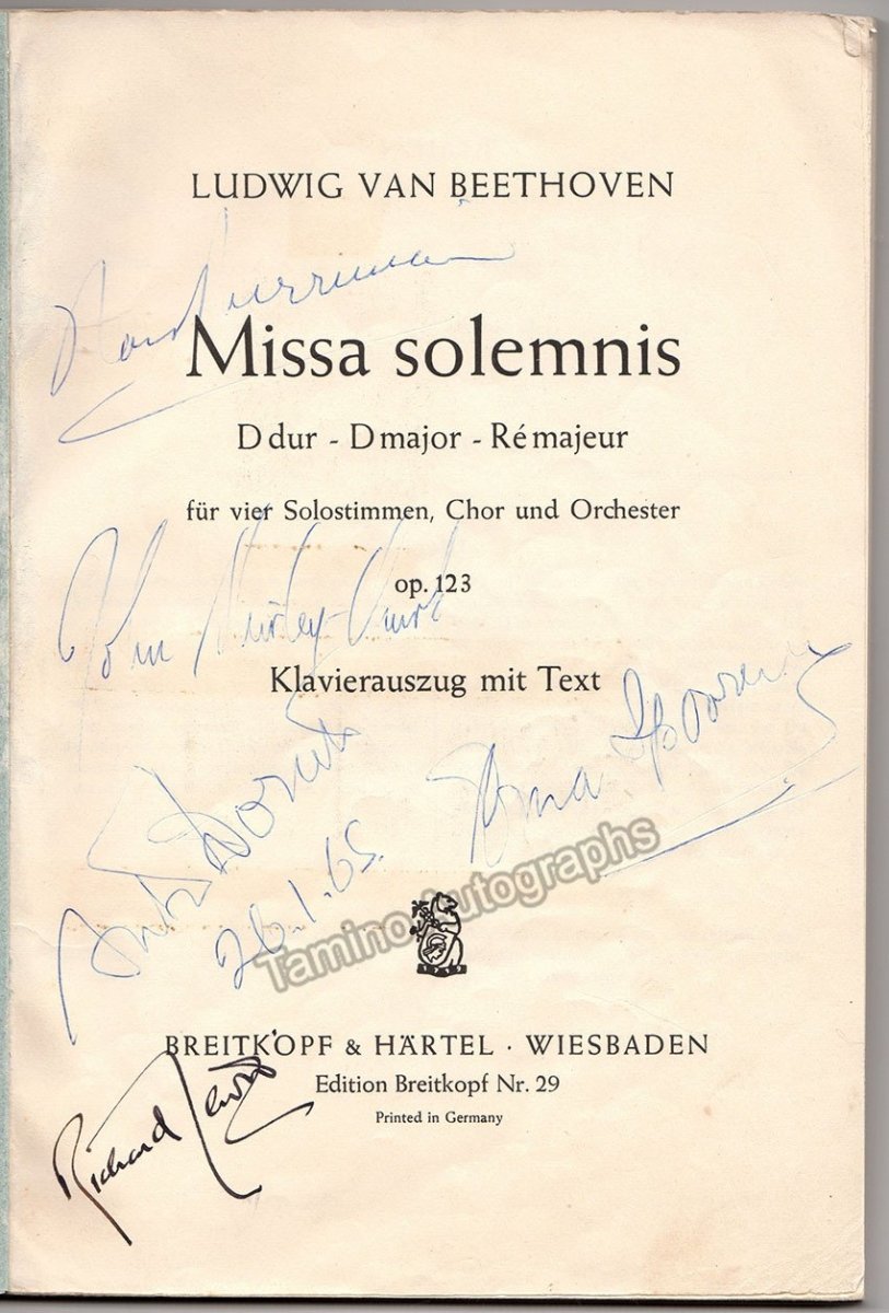 Antal Dorati, Nan Merriman, John Shirley-Quirk, Richard Lewis and Erna Spoorenberg sign score of Missa Solemnis by Beethoven, at the occasion of a concert by the Israel Philharmonic Orchestra, 26 January 1965. On last page as well the signatures of Carlo Maria Guilini, Heather Harper, Anna Reynolds and Raffaele Arie. See scans of page 1, front cover and last page.