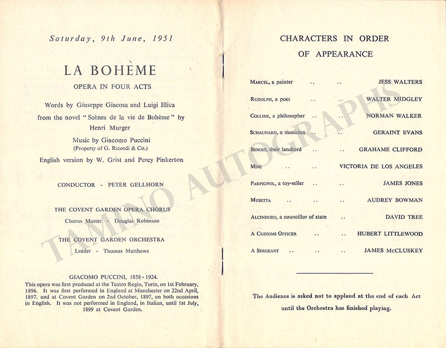 Program for a performance of Puccini's "La Bohème" at The Royal Opera House, Covent Garden, London, on June 9, 1951, signed on the front cover by the famed Spanish soprano Victoria de los Angeles, baritone Jess Walters, soprano Audrey Bowman, and tenor Walter Midgley.