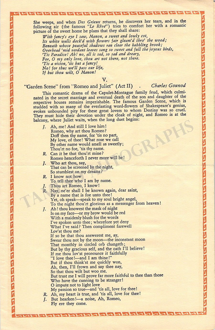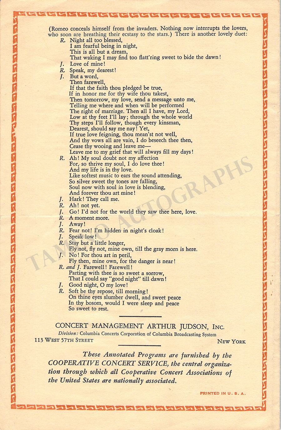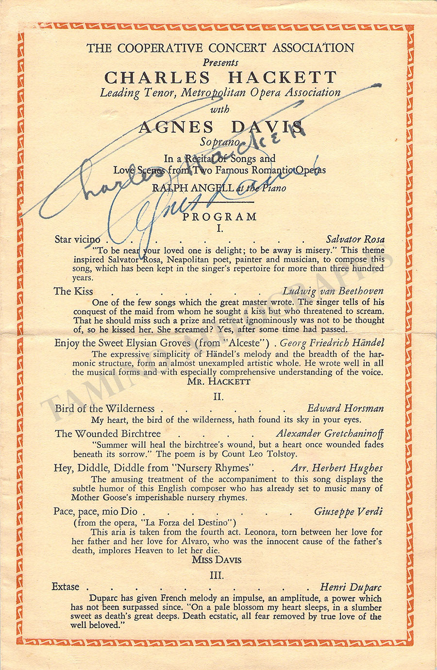 Program for a performance of the celebrated American tenor in New York (no date but circa the 1940s) signed by him and by the soprano Agnes Davis.