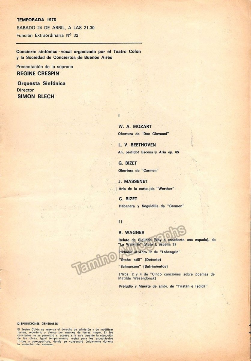 Crespin, Regine - Signed Program Teatro Colon, Buenos Aires 1976 - Tamino Crespin, Regine - Signed Program Teatro Colon, Buenos Aires 1976 - Tamino