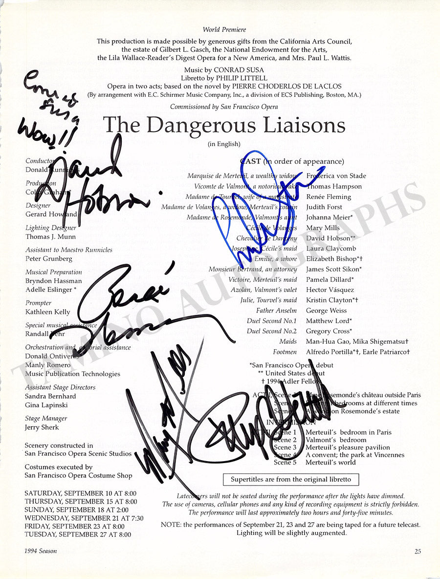 Cast page only for the world premiere of Conrad Susa's opera The Dangerous Liasons at the San Francisco Opera on September 10, 1994, signed by Renée Fleming, Frederica von Stade, David Hobson, Mary Mills, plus one more signature.