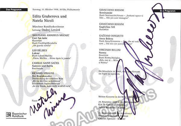 Program for a recital at the Bayerischer Rundfunk, Munich, October 25th, 1998, signed by the star Czech soprano and the Georgian mezzo-soprano on the program page.  Size is 5.9 x 8.25 inches, in excellent condition.
