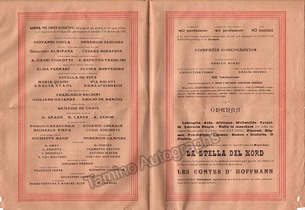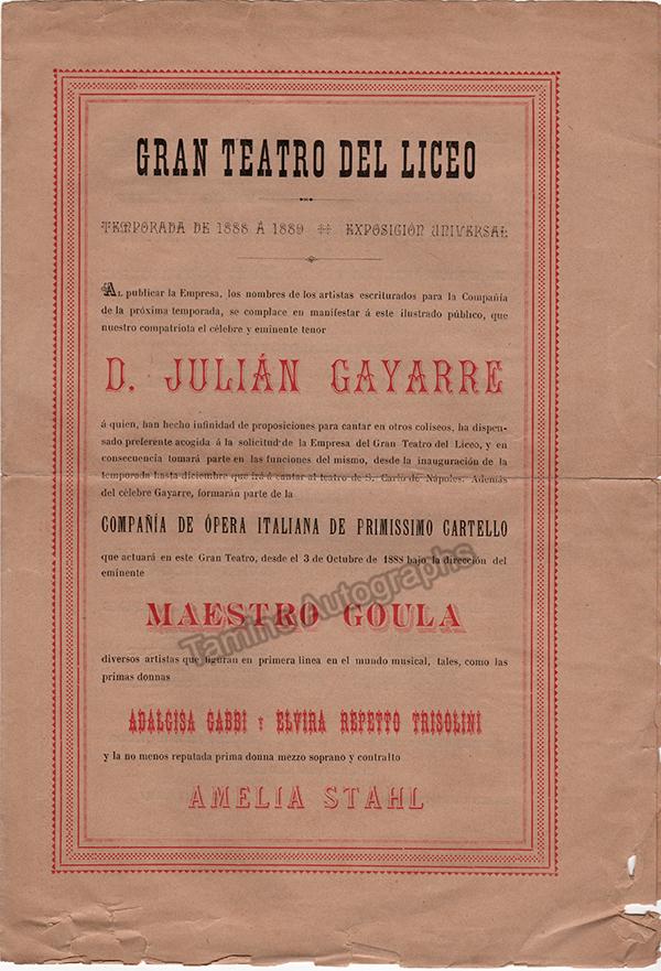 Larger size playbill announcing that star tenor Julian Gayarre will be performing during a period of 2 months (October through December, 1888) at Teatro del Liceo, Barcelona, Spain, with the Italian Opera Company.