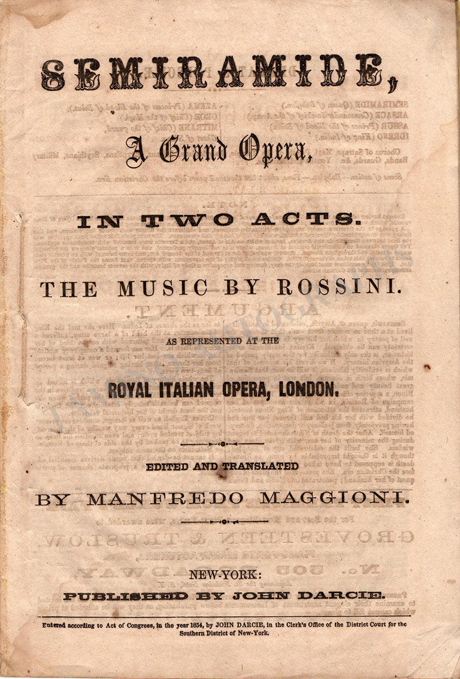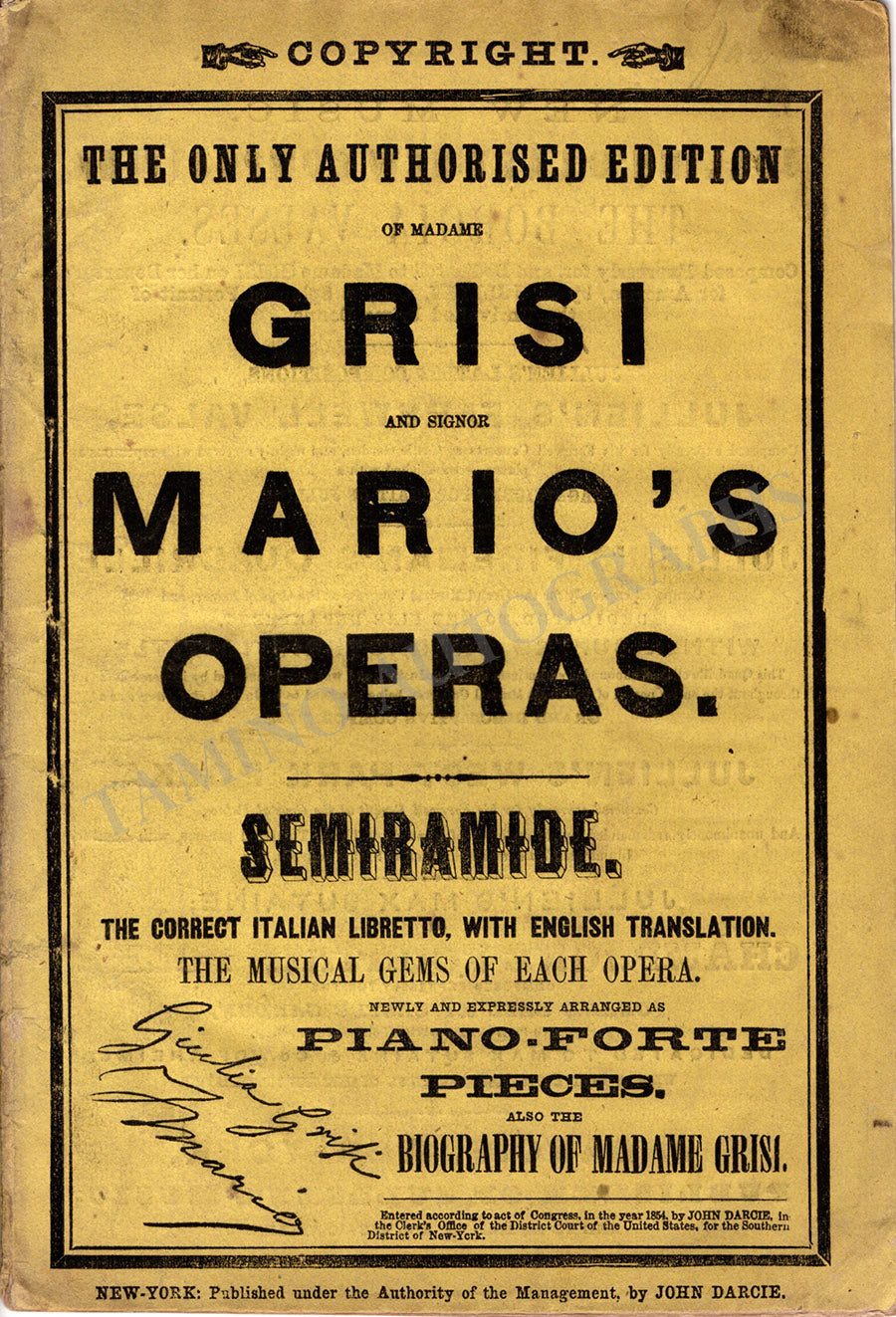 Program-libretto for a performance of Rossini's "Semiramide" (no date, but circa 1860s) featuring soprano Giulia Grisi and tenor Giovanni Mario.
