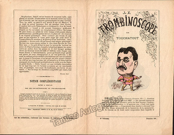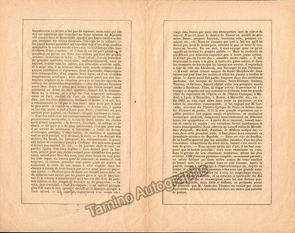 Unsigned promotional article written in 1875 with an attractive etching of the artist in role on the front page, and containing a biography of him on all 4 pages, written in French and sold untranslated. Size of each page is 6.75 x 10.5 inches, small creases and bends, otherwise in very good condition.