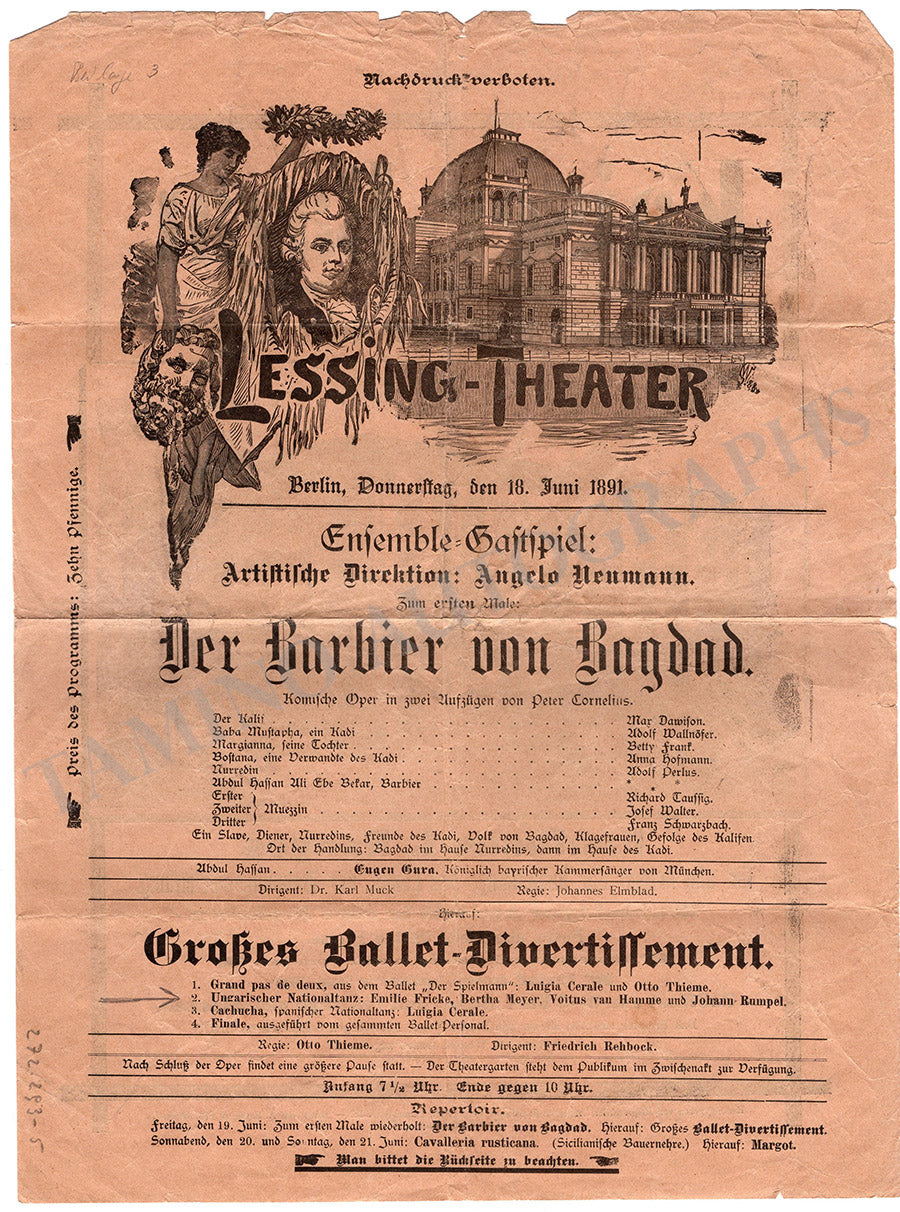 Program (unsigned) for a performance of Cornelius' opera "Der Barbier von Bagdad" at the Lessing Theater (Berlin) on June 18, 1871, conducted by the celebrated German conductor.