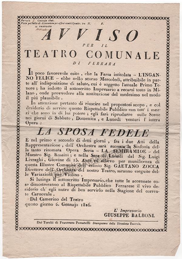 Rare playbill issued in 1826 by the Teatro Comunale di Ferrara, announcing a program change (the opera La Sposa Fedele, which will run instead of the "L´Ingano Felice" (Rossini), which had "little success, in part due to the illness of the first tenor"). One page, 10.75 x 15.25 inches, central fold, in excellent condition. A rare document.