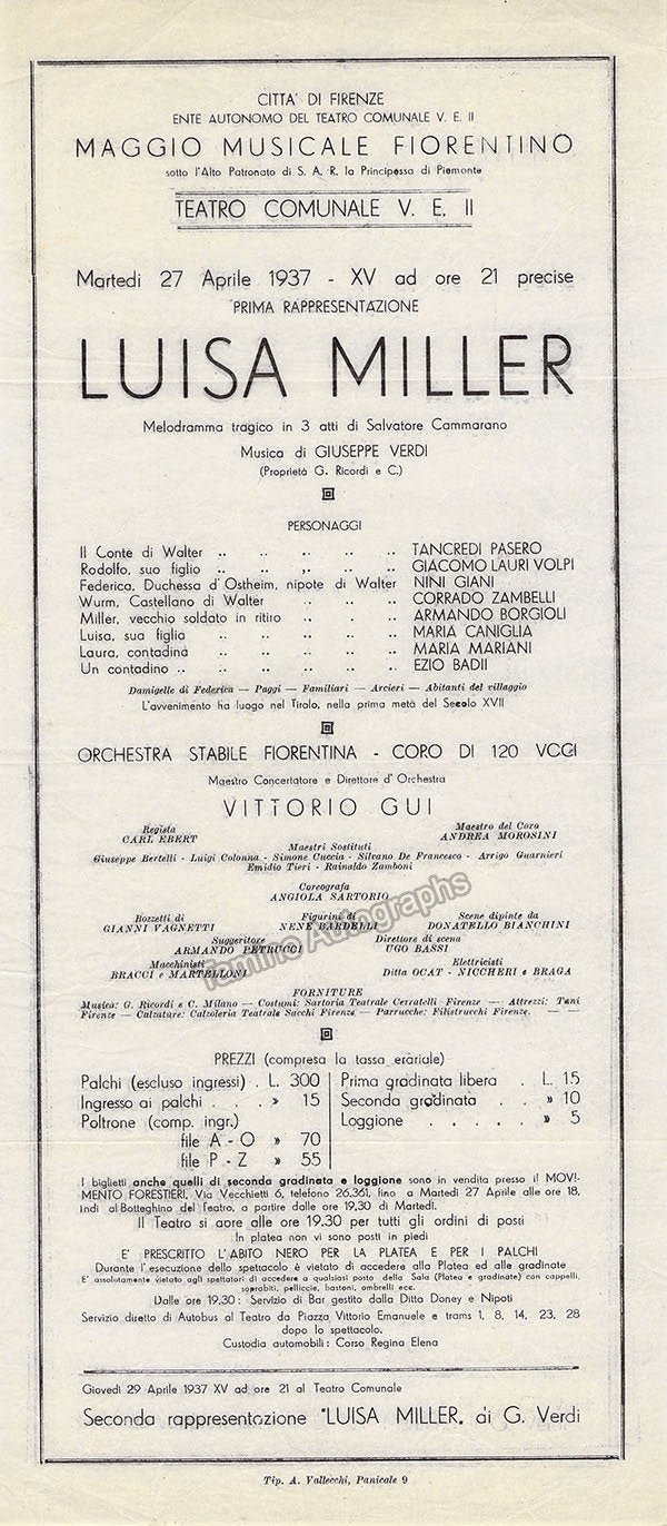 Unsigned playbill announcement for a performance of Verdi's Luis Miller at Teatro Comunale (Florence) starred by the tenor Giacomo Lauri-Volpi, Maria Caniglia and Tancredi Pasero in the leading roles with the Maggio Musicale Fiorentino, under the baton of Vittorio Gui.  Size is 6.2 x 13.2 inches, in excellent condition.