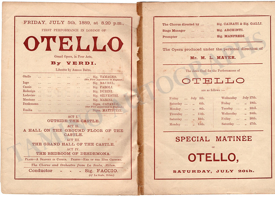 Program for the first performance of Verdi's opera Otello in London,  on July 5th, 1889, at The Royal Lyceum Theatre, featuring the role creators of Otello and Iago, Francesco Tamagno (first appearance in England) and Victor Maurel, respectively.