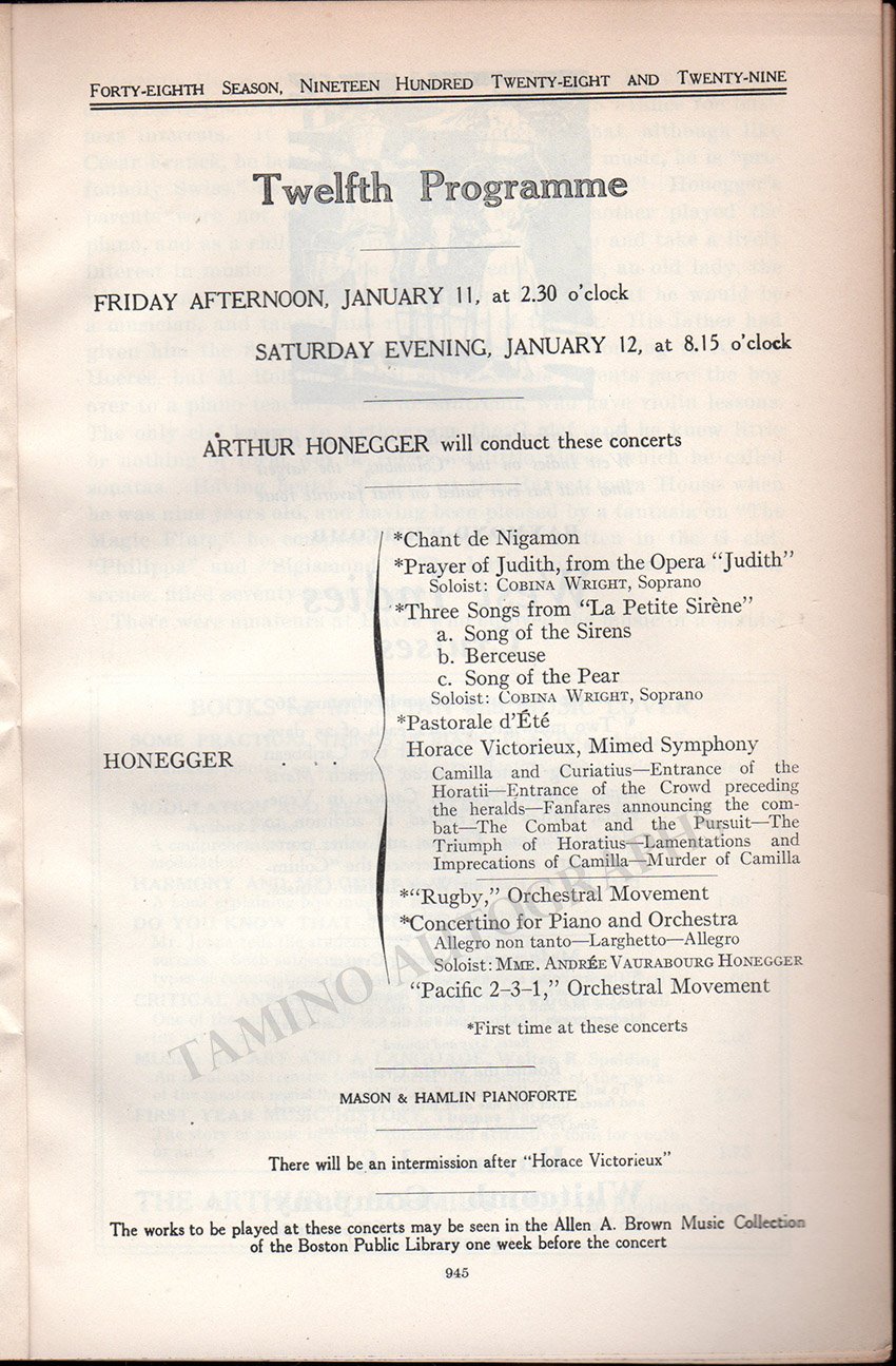 Honegger, Arthur - Concert Program Boston 1929