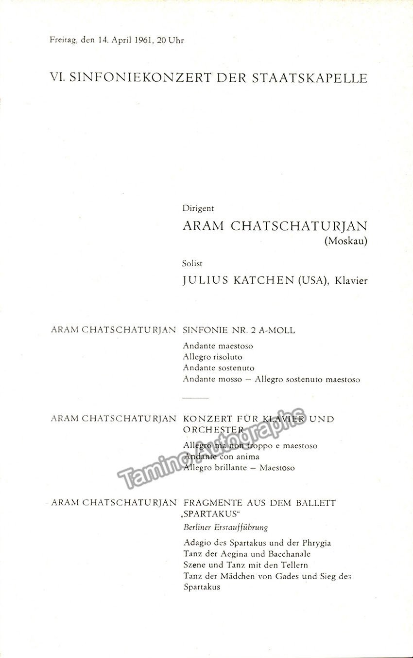 Aram Khachaturian Program - Program conducting Aram Khachaturian's own music - Berlin, April 14th, 1961 - Staatskapelle Berlin - : Aram Khachaturian Soloist: Julius Katchen - Khachaturian: Symphony Nr 2 Khachaturian: Piano Concerto - Khachaturian: Excerpts from "Spartacus" Program, 22.5 x 14.5 cm, 8 pages, excellent condition, full page picture of Khachaturian