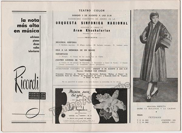 Full program with all pages and covers for a concert at Teatro Colon, Buenos Aires, Argentina, August 3rd, 1957, with the orchestra conducted by famous Russian composer Aram Katchaturian. Concert was entirely dedicated to his music, size is 6.25 x 9 inches, in excellent condition.