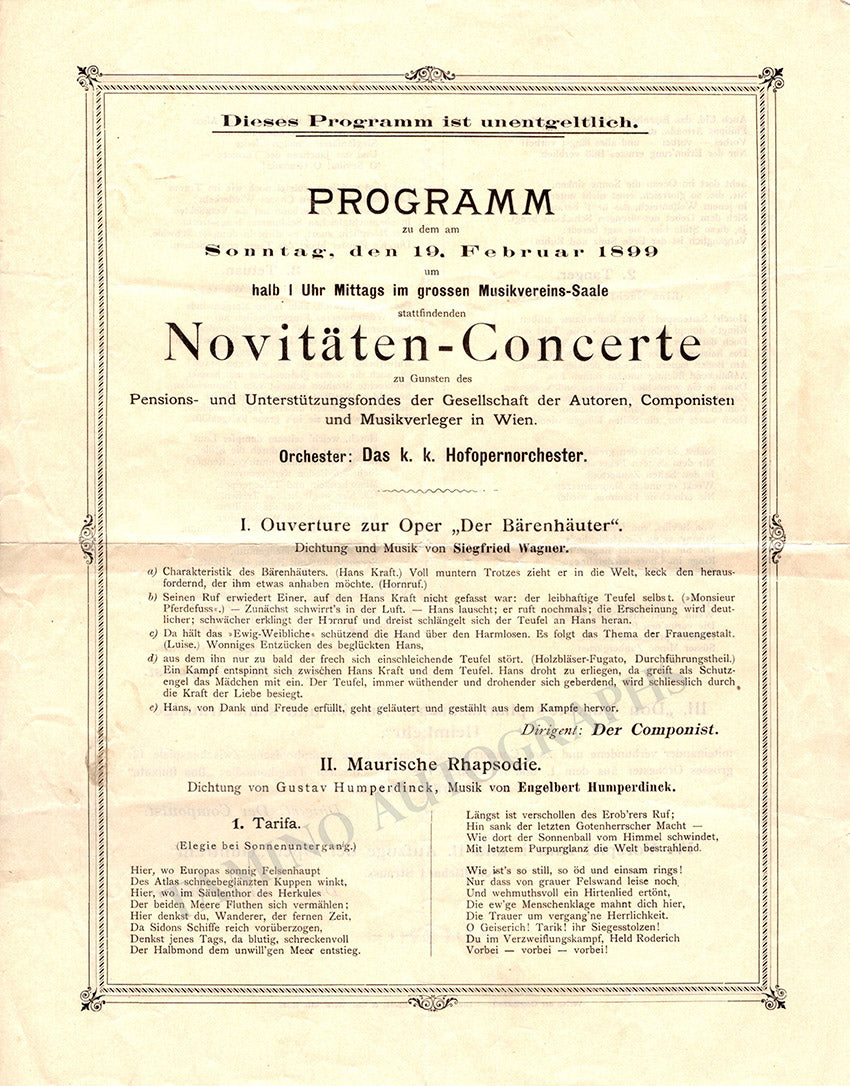 Mahler, Gustav - Humperdinck, Engelbert  & Others - Concert Program Vienna 1899 Mahler, Gustav - Humperdinck, Engelbert  & Others - Concert Program Vienna 1899
