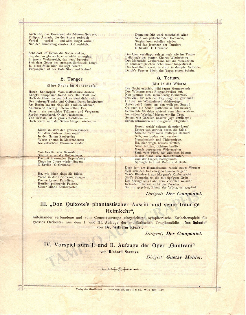Program for a special performance of Siegfried Wagner, Engelbert Humperdinck, Wilhelm Kienzl conducting their own music, and Gustav Mahler conducting music from Richard Strauss' opera "Guntram", in Vienna, February 19, 1899.