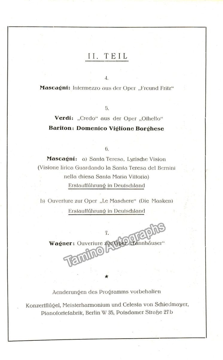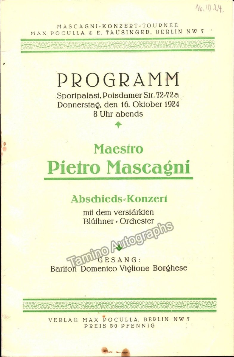 Concert program with him conducting his own music. Berlin Sportpalast, October 16th, 1924, Bluthner Orchester, Cond.: Pietro Mascagni. Soloist: Domenico Viglione Borghese. Smetana: Ouverture Die verkaufte Braute, Leoncavallo: Prolog zu Bajazzo, Beethoven: Symphony No 5, Mascagni: Intermezzo from "L´amico Fritz", Verdi: Credo from "Otello", Mascagni: Visione lirica (Guardando la Santa Teresa del Bernini) (first performance in Germany), Mascagni: Ouverture "Le Maschere" (first performance in Germany) Wagner: Ouverture, Programme, 8 pages, 21,5 x 13,5 cm, paperback, with full page picture of Mascagni, an interview and second picture of Mascagni, art deco cover, excellent condition