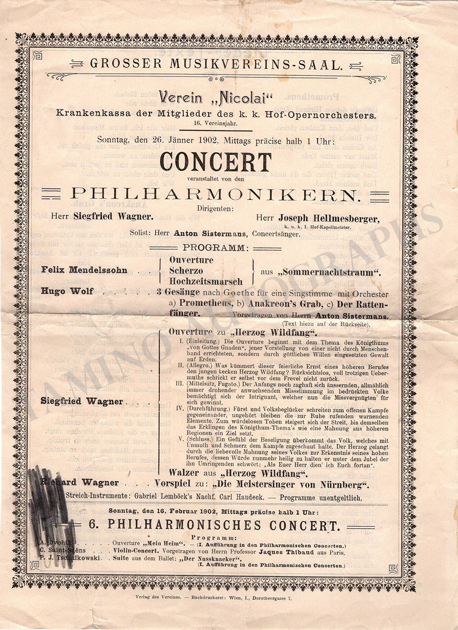 Program (unsigned) for a concert of the German composer in Vienna, January 20, 1902, conducting his own works, plus works by his father Richard Wagner, Mendelssohn, and Wolf-Ferrari.