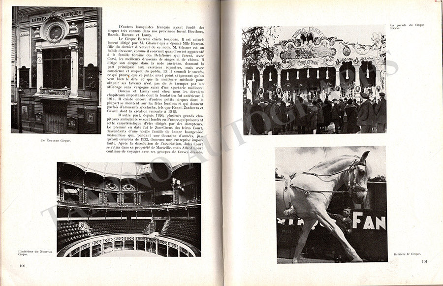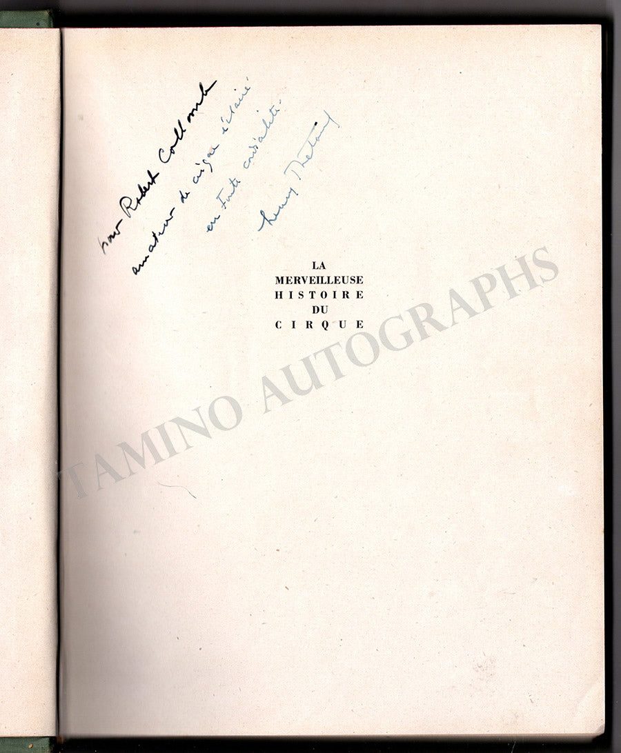 The first volume of his book "La Merveilleuse Histoire du Cirque" signed and inscribed by him on the first title page with a short sentiment. First edition by Prima (1947), 271 pages with illustrations and photographs, hardcovers, size is 8.5 x 11.1 inches, in very good condition.