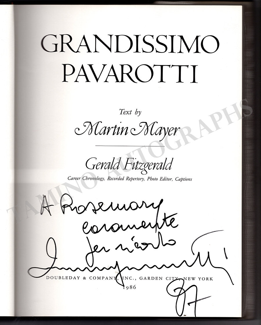 The book Grandissimo Pavarotti signed and inscribed by the tenor on the title page with a short sentiment in 1997; published by Doubleway & Co, New York, 1986. Size is 9.2 x 12.2 inches, hard covers, 224 pages, in excellent condition.