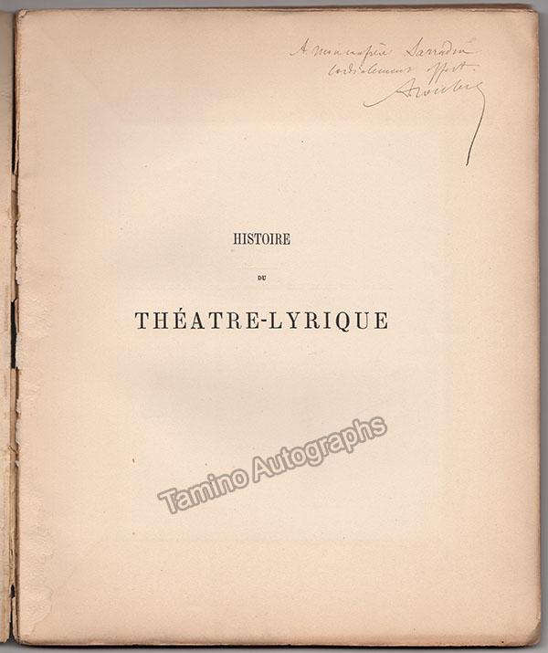 French writer (1846-1918).  First volume of his work "Histoire du Théatre-Lyrique", published by Librairie Fischbacher, Paris, 1899, signed by the author on the first title page.  Size is 9.25 x 11 inches, 59 numbered pages plus extra non numbered pages, soft covers, some rust on covers and minor spine damage, otherwise in very good condition.
