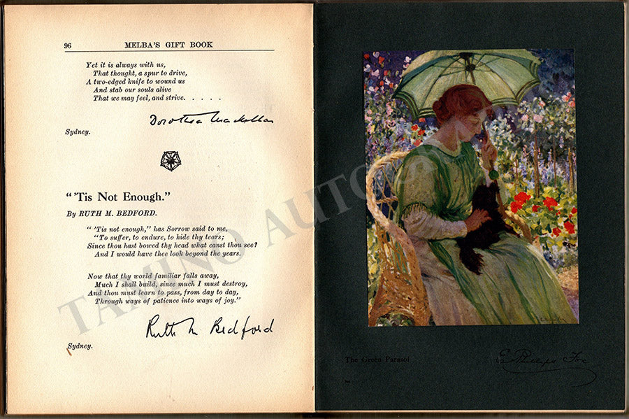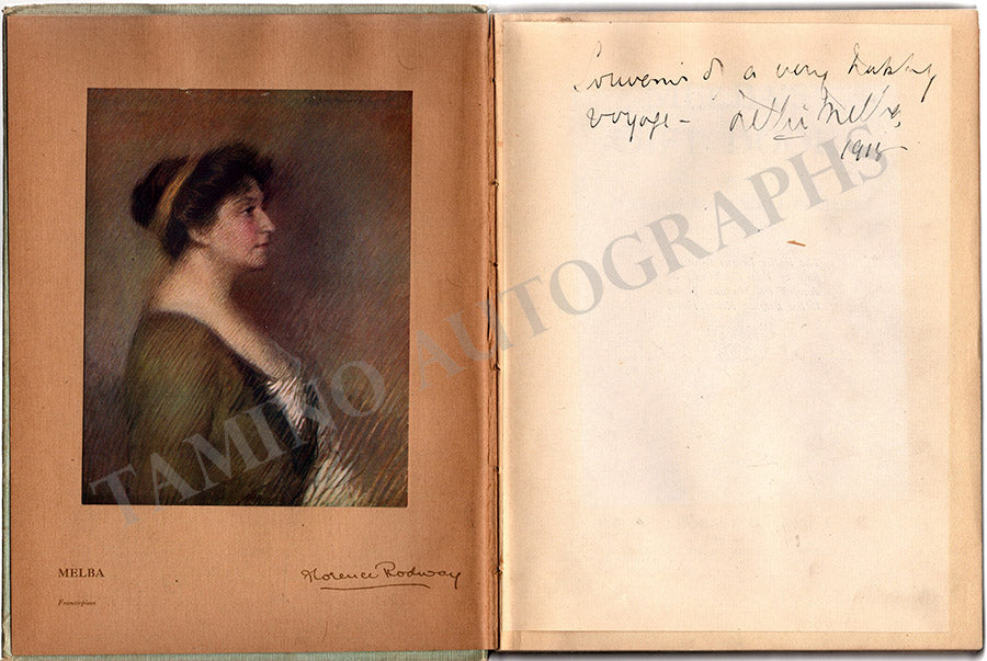 Book "Melba's Gift Book of Australian Art and Literature" signed by the famous soprano with a short sentiment and dated in 1918 on the first blank page opposite her printed image in color by the Australian artist Florence Rodway.