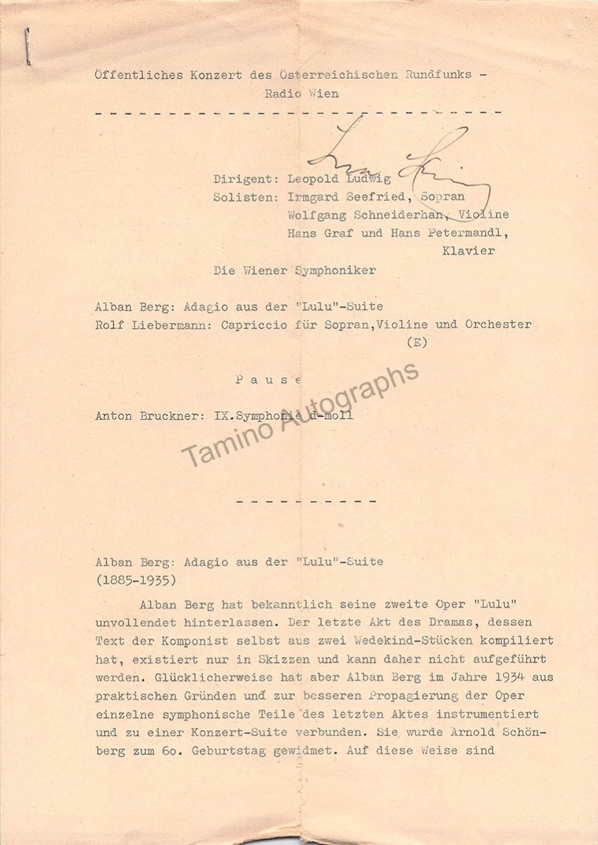 Four-page program for a concert in Vienna with the Austrian Radio Orchestra, 1961, Ludwig signed on the first page of this typewritten and printed program, 8.25 x 11.6 inches, central fold, in good condition.