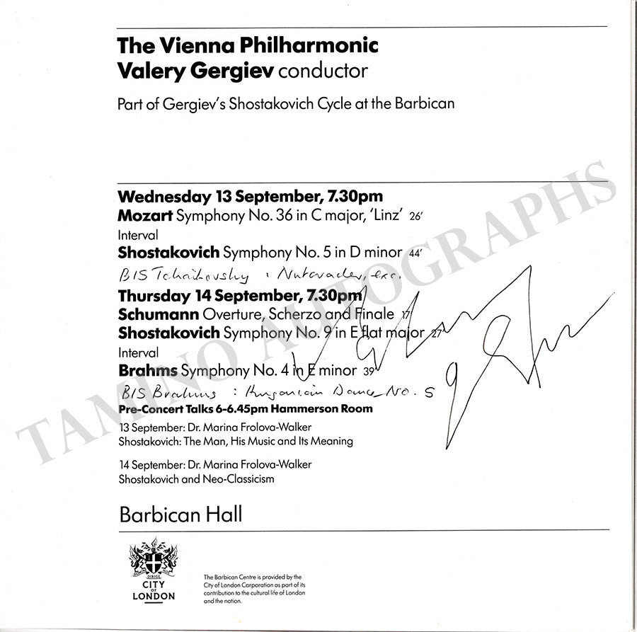 Program for a performance of orchestral works by Shostakovich, Mozart, Schuman, and Brahms by the Vienna Philharmonic under the baton of Valery Gergiev at the Barbican Hall, London, on September 13 and 14, 2006, signed by the Russian conductor.