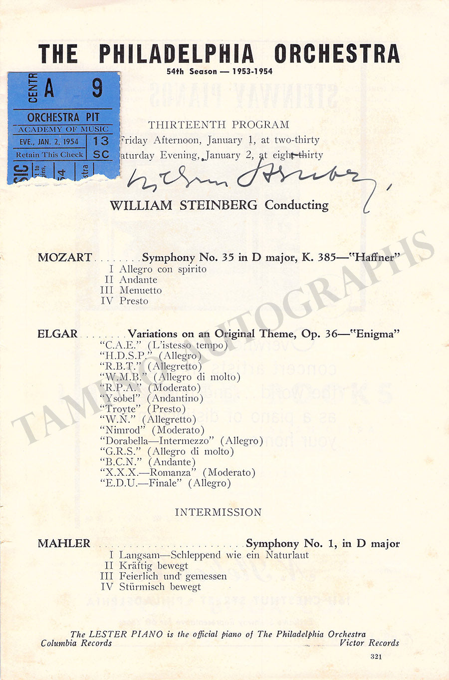 Page from a program for a performance of works by Mahler and Mozart by The Philadelphia Orchestra in Philadelphia on January 1954 conducted by Steinberg and signed by him.