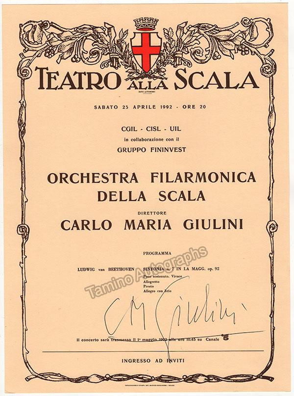 Playbill announcement for a concert of Beethoven's 7th Symphony at Teatro La Scala on April 25, 1992, performed by La Scala Philharmonic Orchestra, under the baton of the Italian conductor, signed by him.  Size is 11 x 15 inches, in excellent condition.