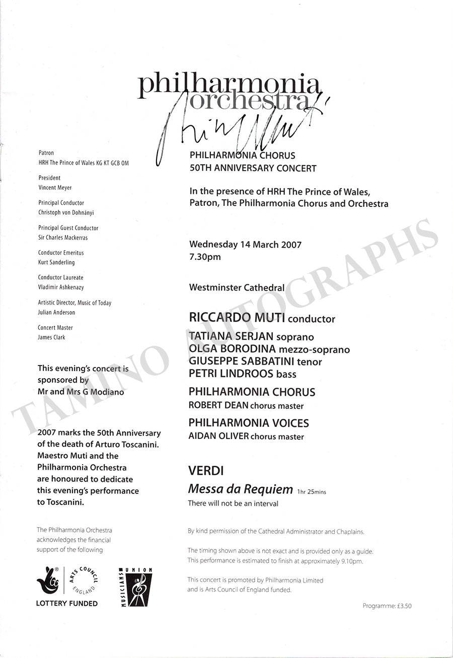 Concert program for a performance of Verdi's Requiem at the Westminster Cathedral, London, on March 14, 2007, featuring Tatiana Serjan, Olga Borodina, Giuseppe Sabbatini, Petri Lindroos, and the Philharmonia Chorus and Orchestra under the baton of Riccardo Muti, and signed by him.