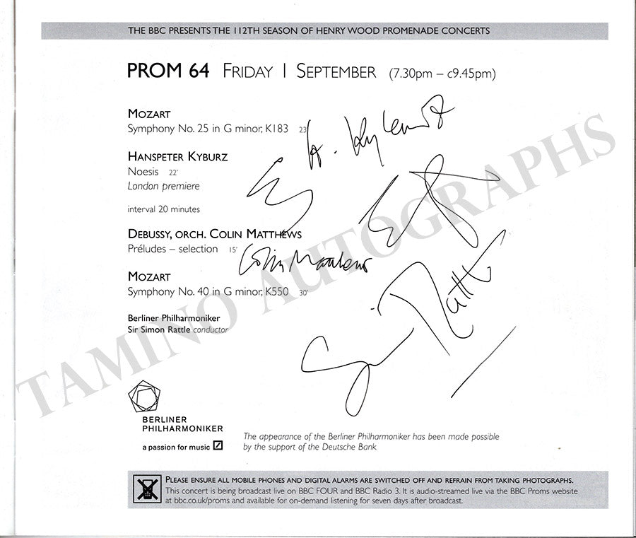 Concert program for the PROM 64, London, September 2006, featuring the Berlin Philharmonic under the baton of Simon Rattle, signed by him.