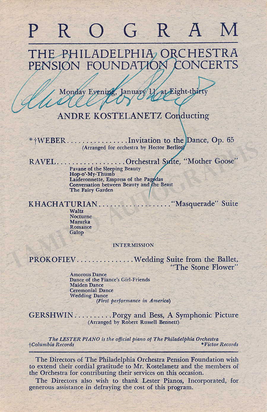 Original program for a performance of the Philadelphia Orchestra at the Academy of Music, Philadelphia, January 1954, conducted by Kostelanetz and signed by him.