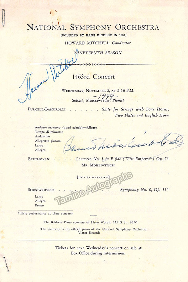Program for a performance of the star Russian-born British pianist with the National Symphony Orchestra in 1949, signed by him and by conductor Howard Mitchell.