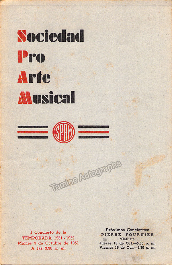 Program for a recital of different works for piano performed by the Cuban pianist at Sociedad ProArte Musical, Havana, October 9, 1951, signed by him on page 3.