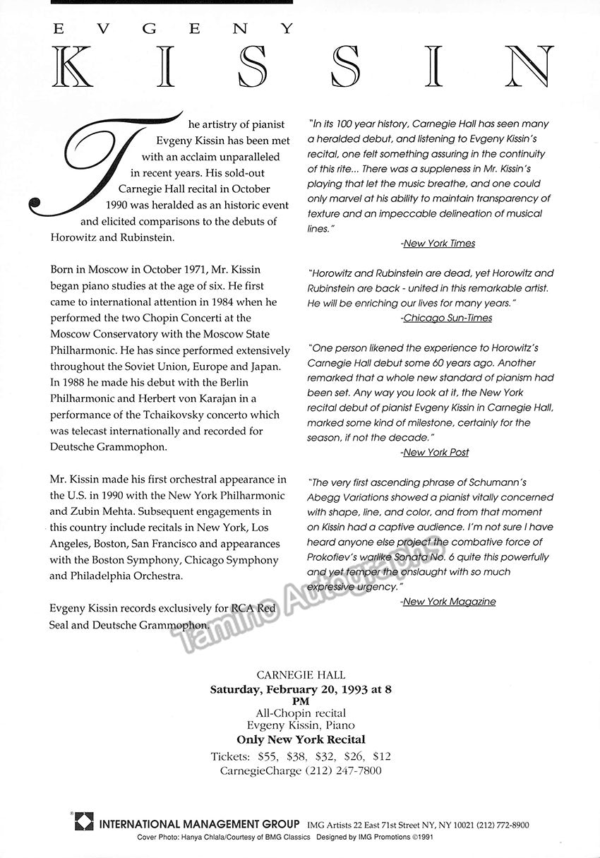Kissin, Evgeny - Signed Flyer New York 1993 Kissin, Evgeny - Signed Flyer New York 1993