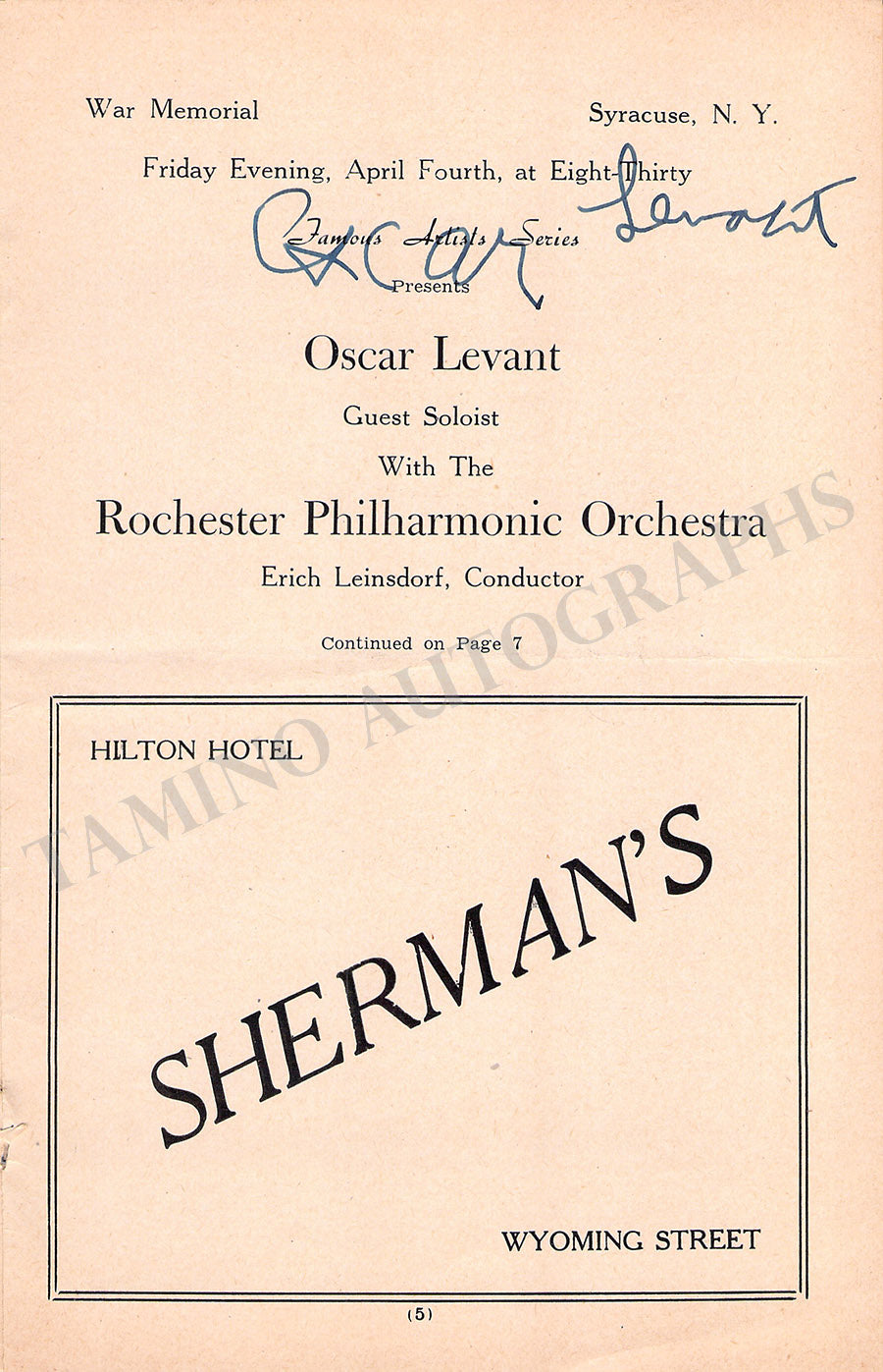 Levant, Oscar - Signed Program N.Y. Levant, Oscar - Signed Program N.Y.