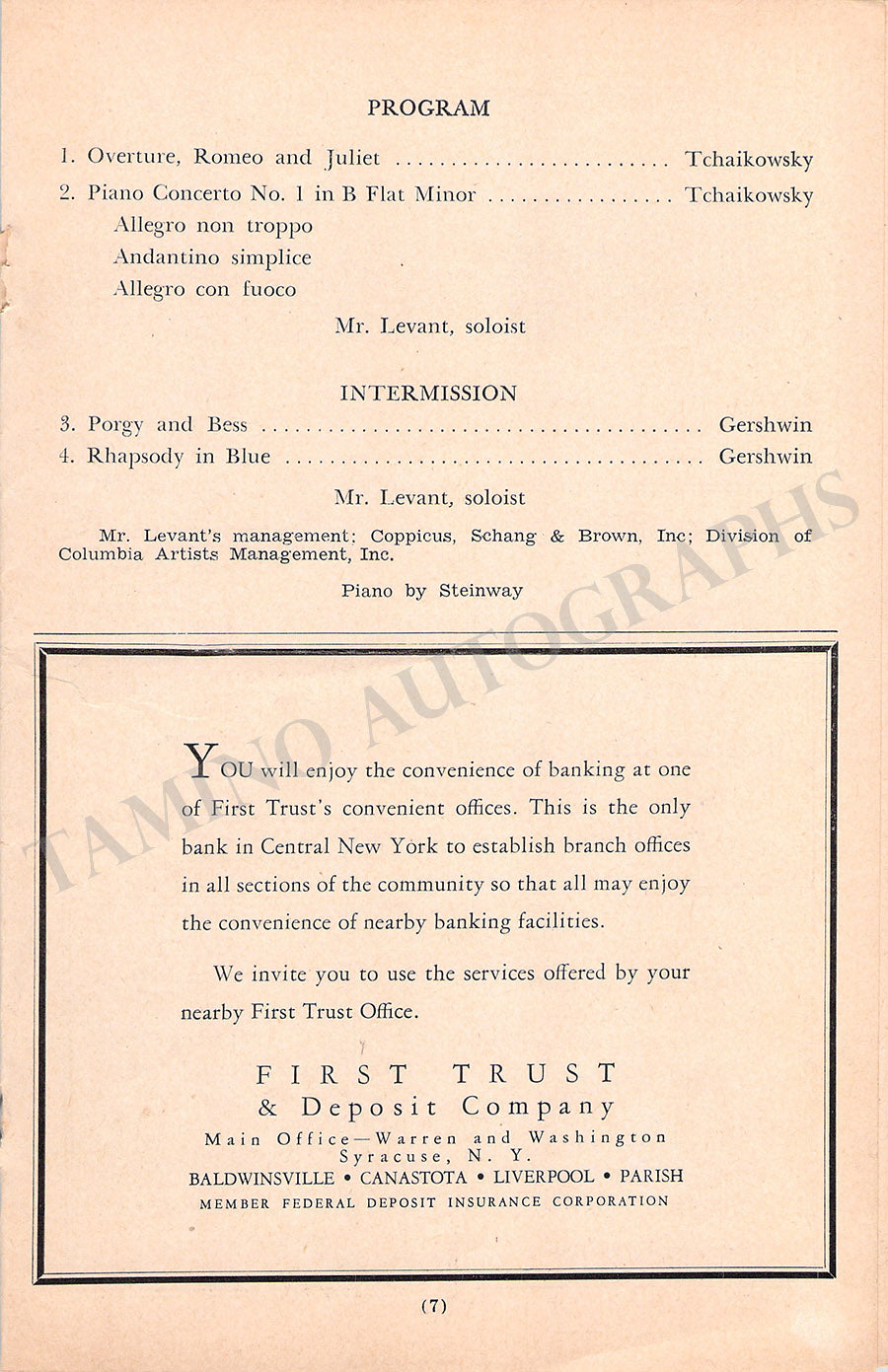 Program signed by the American pianist on the cover for a his performance with the Rochester Philharmonic Orchestra in Syracuse, NY on April 4th (no year), under the baton of Erich Leinsdorf.