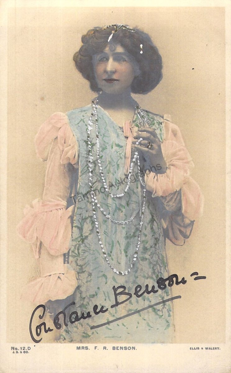 British actress of stage and film (1864-1946). Beautiful colorized photo postcard signed by her, shown in role. Size is 3.4 x 5.5 inches, scattered silvering over the photograph, in excellent condition.